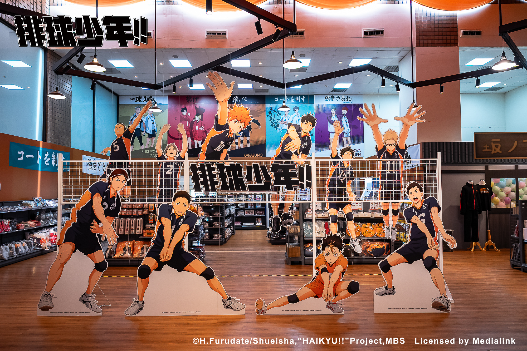 一出電梯口,遠遠就能看見快閃店主視覺在門口,看進門內,咦!怎麼會有人在店內打排球?原來這次快閃店把立體排球場帶進展場啦!看日向、影山高飛殺球,月島攔網等十位烏野高中選手的英姿,想一睹熱血沸騰的比賽就來這!只有球員還不夠,教練烏養及顧問武田也在一旁,旁邊還有青葉城西的及川與岩泉,和音駒主力黑尾與孤爪。