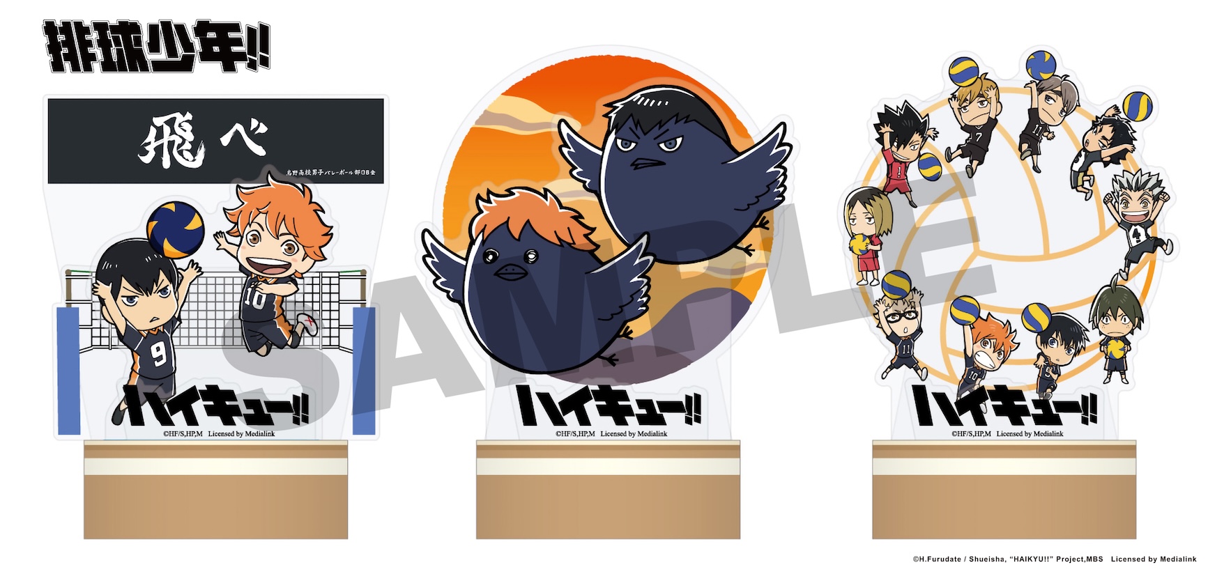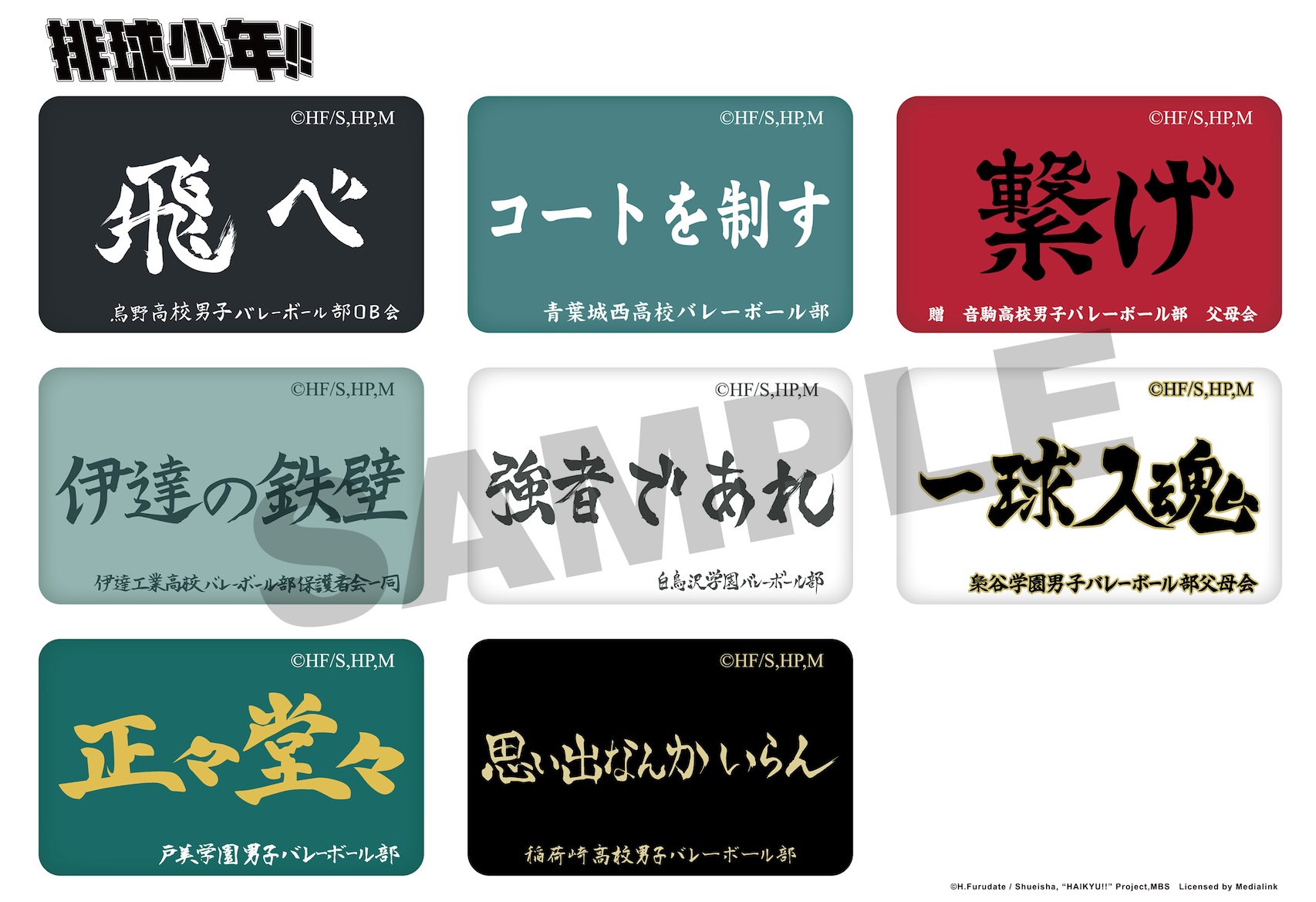 讓《排球少年!!》的熱血應援也充滿你的生活周邊吧!「方形小夜燈」有日向、影山帥氣英姿,擺桌上讓人氣角色陪你一起唸書、工作。可以別在包包或衣服的「布面徽章盲抽」,就像迷你應援旗般,有烏野高中的「飛吧」、青葉城西高中的「制霸球場」、音駒高中的「維繫」等八款,快來看看會抽到哪個學校吧!三款「簽名版」有烏野高中、青葉城西高中和梟谷學園高中,帶到球場可以、擺在家中當裝飾又好看實用,粉絲們快來帶回家吧!