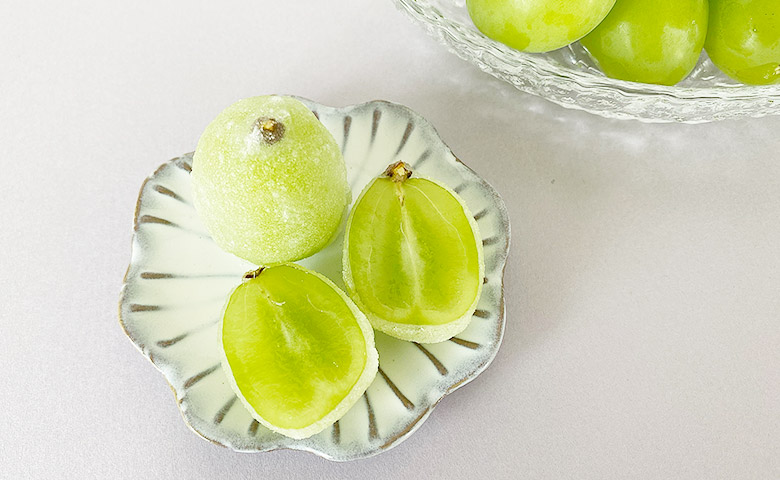 整顆麝香葡萄(ひとつぶのマスカット)是一款將當天早晨現採的麝香葡萄,以薄如蟬翼的求肥細緻包裹而成的奢華點心。所用葡萄為專門為此甜品栽培的最高級品種「亞歷山大麝香葡萄(マスカット・オブ・アレキサンドリア)」,微帶酸味的果肉與求肥的甜味交織,成就絕妙平衡。由於每顆葡萄大小略有差異,要將其完美地以薄求肥包覆,必須全程手工製作。自1979年首次推出至今40餘年,仍由經驗豐富的職人一顆顆細心包製。此甜點僅於麝香葡萄產季的4月底至9月期間限定販售。若在此時節造訪廣島,不妨前往旬果瞬菓共樂堂,品嚐這份只有當季才能享受的極致美味。