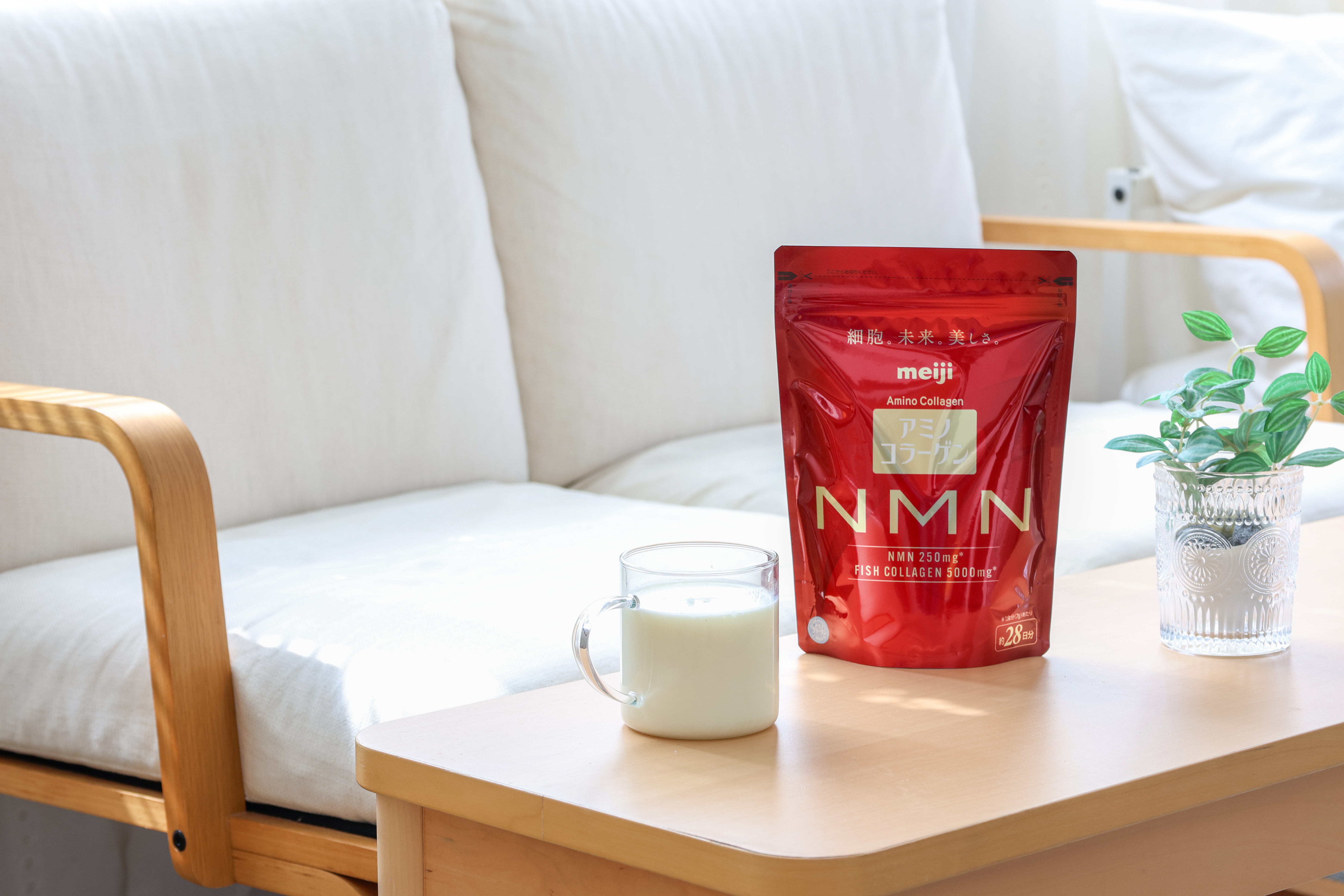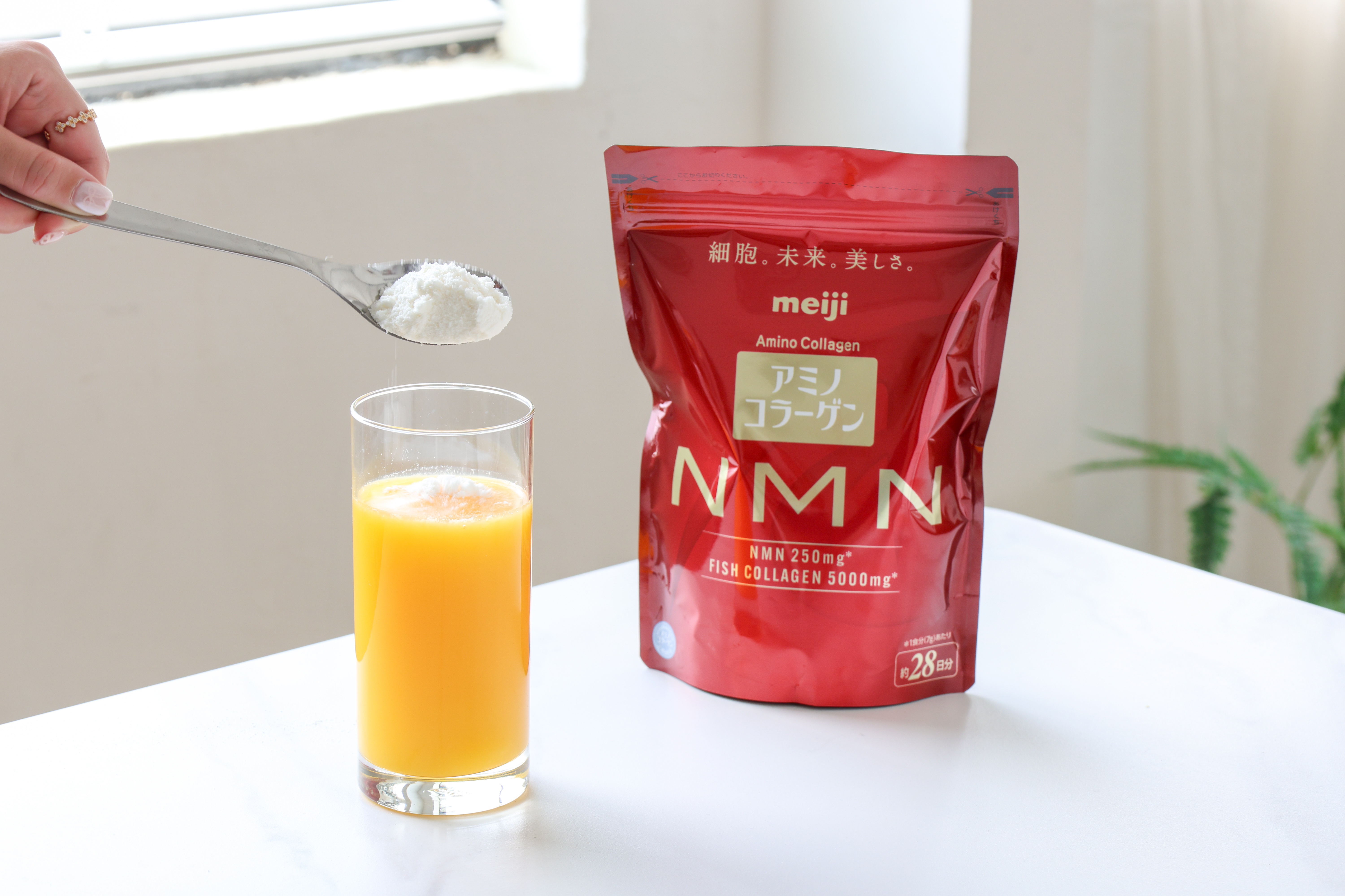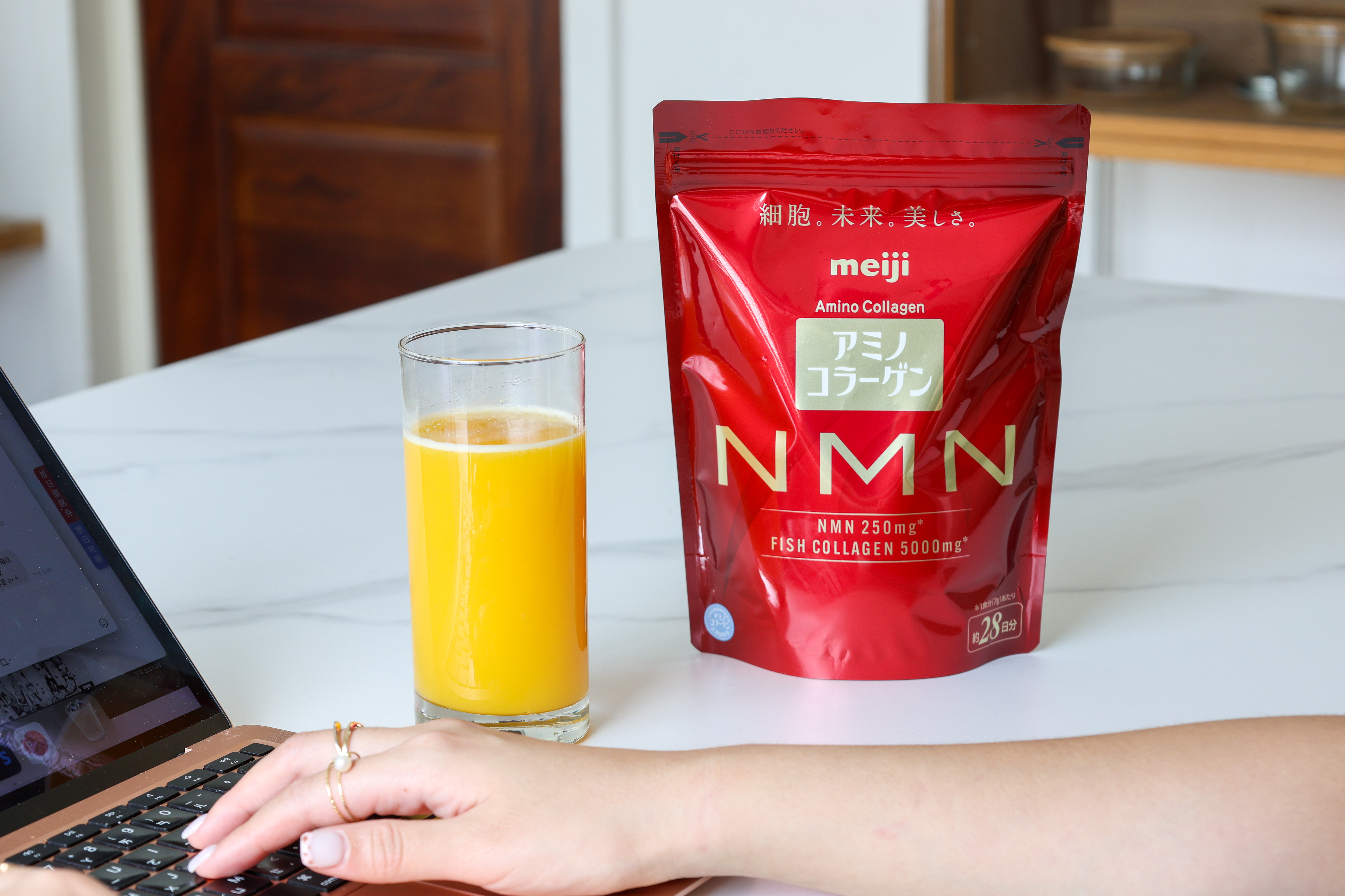 明治嚴選使用純度 99%以上的 NMN 原料,一次攝取即可同時補充 5,000mg 魚膠原蛋白 與 250mg 高純度 NMN,不僅能維持外在,更能從體內深層著手,內外皆備!