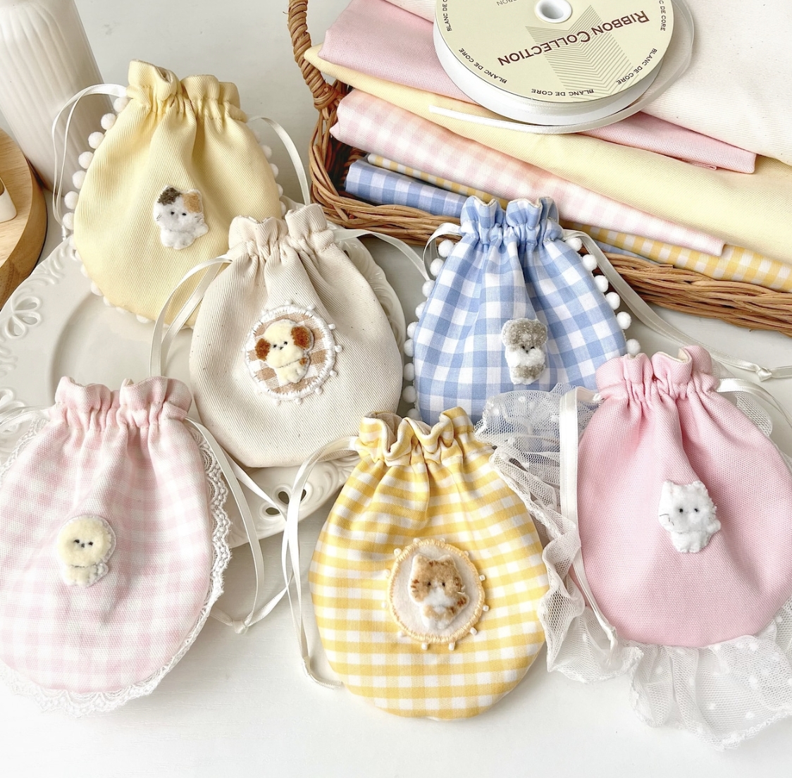而這款束口袋則是同時運用了刺繡與俄羅斯刺繡兩種技法所製作出來的,由於俄羅斯刺繡比較適合大面積的部分,因此像是小圖案的輪廓或五官等地方,就會用刺繡的針法去呈現。