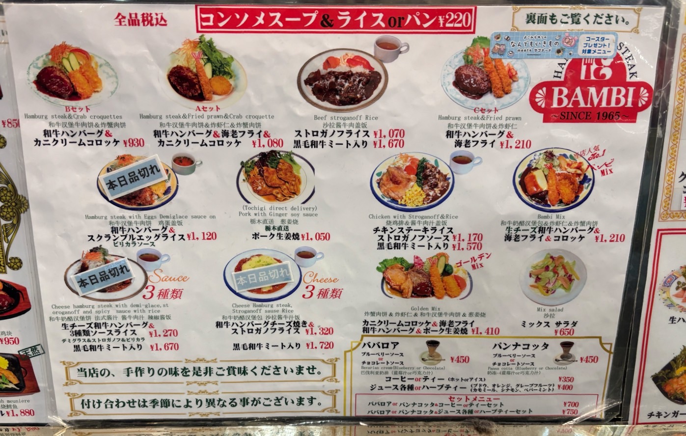 位於新宿サブナード地下街的「バンビ Hamburg & Steak」,是一家充滿昭和懷舊氛圍的老字號洋食店。自昭和40年(1965年)創業以來,一直堅持以手工製作、用心烹調每一道料理。半世紀以上的歷史不僅帶來了熟悉的懷舊氛圍,也讓它成為許多日本當地居民的經典洋食名店。