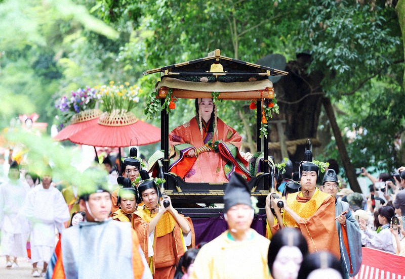 說到葵祭的重頭戲,就是由多達500人組成的盛大遊行,由事前被選出的重要人物「齋皇女」為中心,再搭配上身旁的護衛簇擁著隊伍前行。遊行者們在遊行時都會穿上平安時代的精緻貴族服裝,並裝飾上祭典象徵的葵葉,在遊客們的面前展現出華麗且優美的平安繪卷。