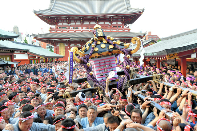 說到三社祭的看點,那想必是第一天的大遊行與第二天的神轎聯合遊行了,在大遊行時,人們會穿上古時的服裝,與藝妓和舞者們一同在淺草的街道上進行遊行,到了第二天,則會從淺草神社周遭的街區抬出約100台神轎,並精神飽滿的一邊吆喝一邊遊行,據說可以保佑農漁業豐收,並驅除病痛,其壯觀程度值得各位一見。