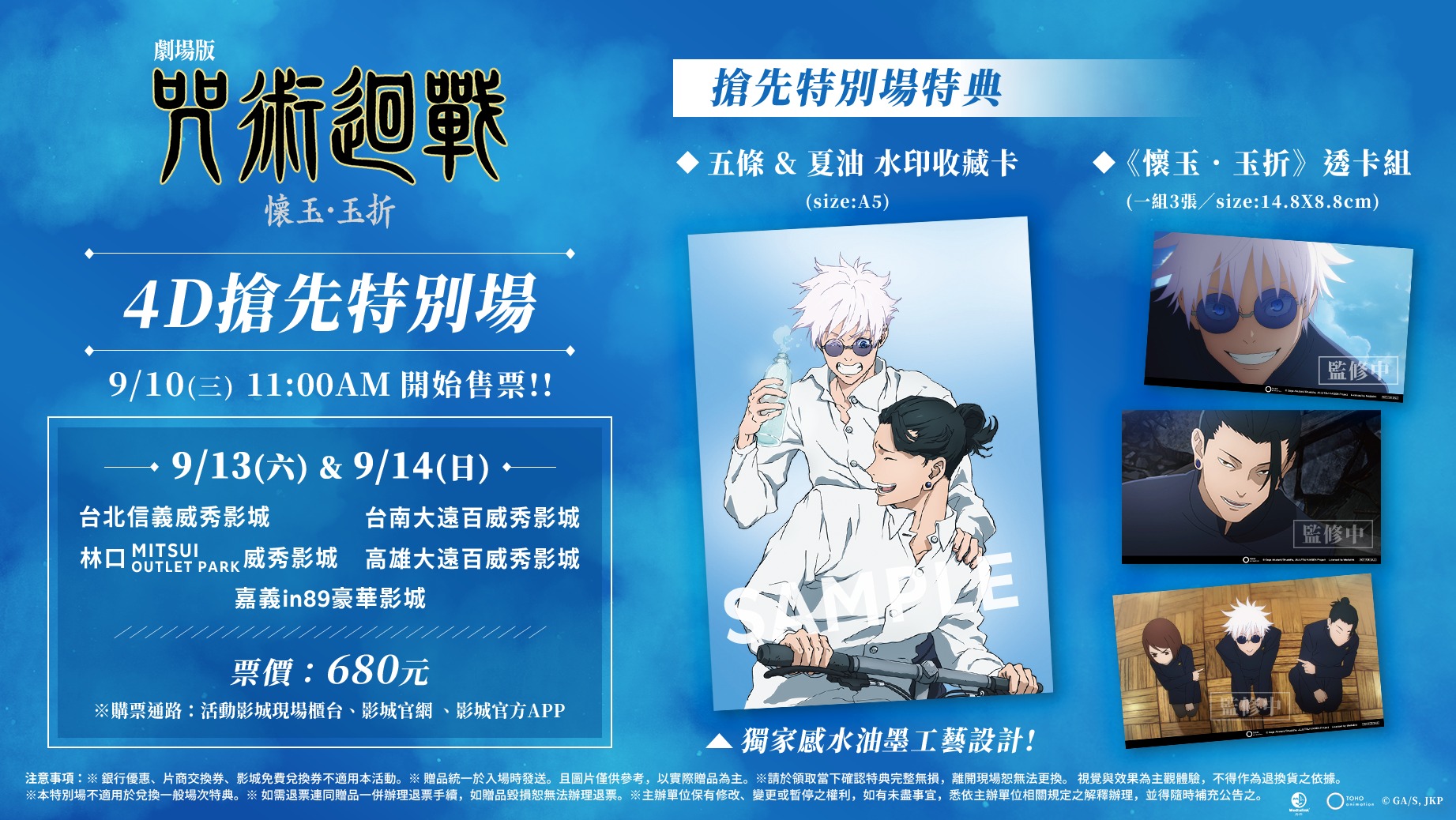 超人氣動畫電影《劇場版 咒術迴戰 懷玉・玉折》上映後票房破千萬,本週熱度與話題討論不減;片商宣布原本預定於9月19日(五)推出的4DX與MX4D版本,提前於本週六、日(9月13日、14日)兩天推出特別場,預售票於9月10日(週三)正式開賣,這兩天的特別場除了原本4DX與MX4D特典:全台特典首發「五條&夏油」水印收藏卡外,再加贈《懷玉‧玉折》三張透卡組,滿滿咒術高專的青春回憶,勢必引起搶購熱潮!