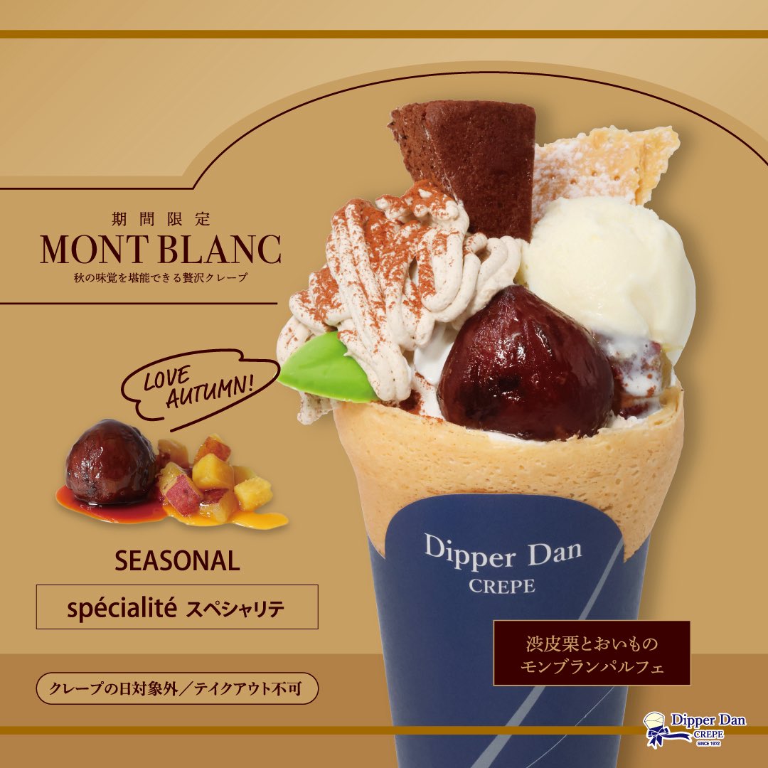把可麗餅打造成如同豪華聖代般、在可麗餅上面放滿豐富餡料,包括一整顆飽滿的蜜漬栗子、栗香地瓜、栗子鮮奶油、香草冰淇淋、千層酥、布朗尼、可可粉,每一口都讓甜食控得到大滿足!這是由可麗餅專賣店「dipperdan」(ディッパーダン)在今年秋季特別獻上的期間限定口味「栗子地瓜蒙布朗聖代可麗餅」。