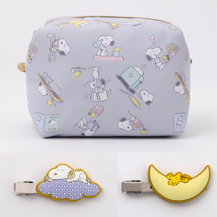 印有史努比與胡士托用餐場景的化妝包以及超可愛的前髮夾組。