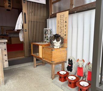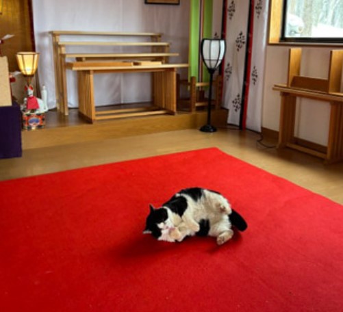 雖然在稻荷信仰中狐狸是神明的使者,但在清田稻荷神社,黑貓似乎也成了守護神的化身。如今境內仍能見到多隻黑貓,以及燕尾服貓、虎斑貓等地域貓,總數約13隻。牠們不僅負責守護事務所、授予所,巡邏境內,還擔任每天迎接參拜者的「官方小小員工」。悠閒自在的貓咪身影與朱紅鳥居相映成趣,也成為參拜者心靈上的療癒與慰藉。