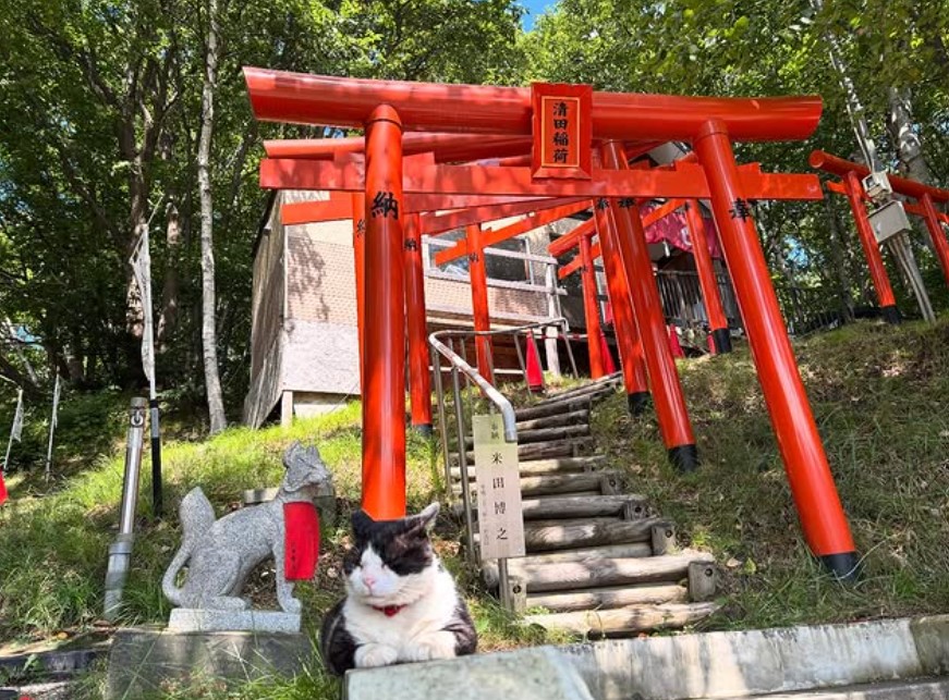 位於北海道札幌市清田區的 清田稻荷神社,雖然創建歷史不長,卻因自京都伏見稻荷大社分靈而來,成為札幌少有的正統稻荷信仰據點。這裡不僅是祈求商業繁盛、五穀豐收與家宅平安的靈驗之所,更因與黑貓的神秘緣分而聞名。境內經常可見黑貓與其他地域貓悠閒地巡遊,與朱紅鳥居交織成療癒又夢幻的景致,吸引了眾多愛貓人士與攝影愛好者前來朝聖。