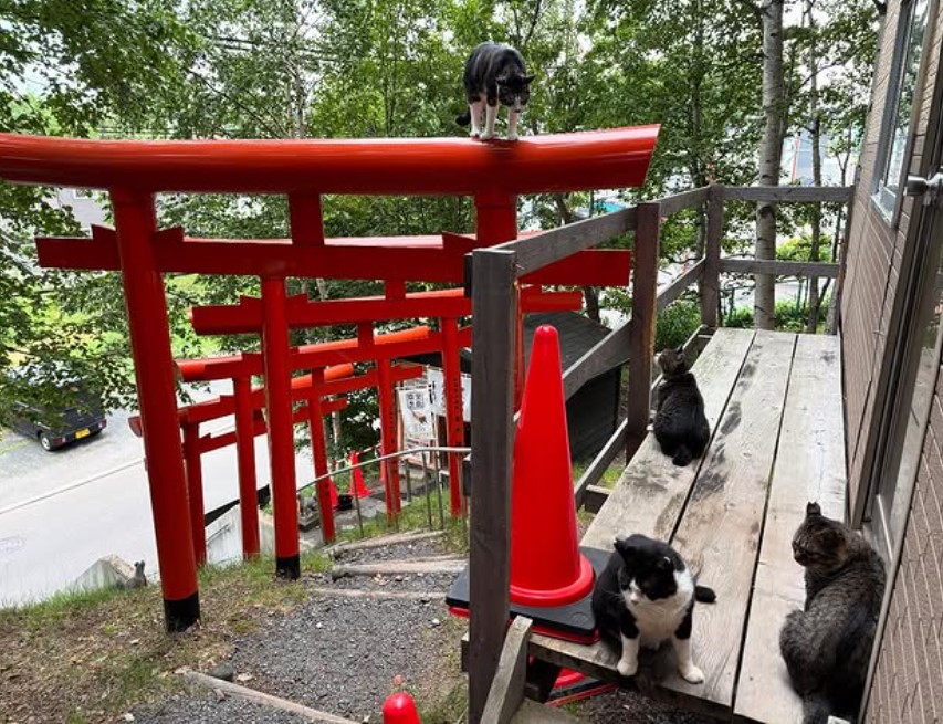 神社境內有許多適合拍照的景點,最受歡迎的莫過於鮮豔的朱紅鳥居與黑貓同框的畫面,強烈的色彩對比讓照片充滿張力。螺旋狀的原木階梯也是貓咪經常出沒的地方,宛如天然的攝影棚,而在陽光下悠閒曬太陽的境內貓咪,更是旅人鏡頭裡最療癒的風景。也因此,清田稻荷神社不僅是祈福參拜之所,更成為 Instagram 等社群平台上超人氣的「貓參拜(猫詣)」打卡聖地。
