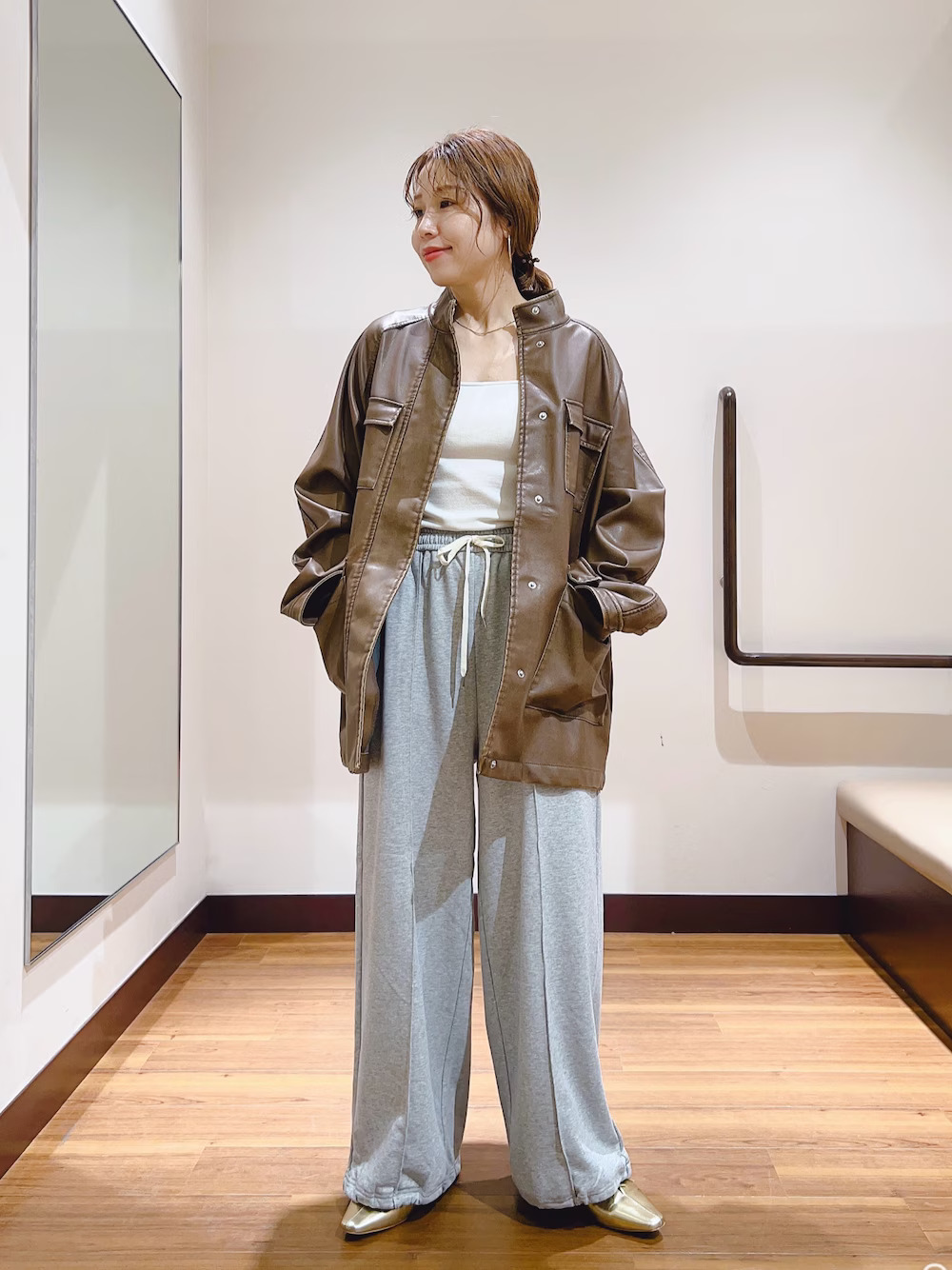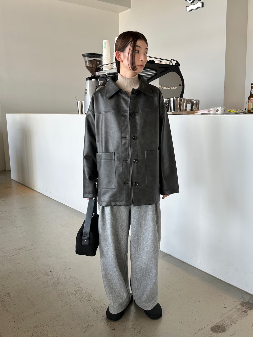 以皮衣外套加棉質長褲,堪稱高階版的造型參考,更是日本女生最愛穿的搭配,尤其給人休閒感受的棉褲,讓酷帥皮衣外套增添不同的風格表情,也使外出衣著更加輕便舒適,鞋履不論選平底鞋或厚底鞋都很合適。