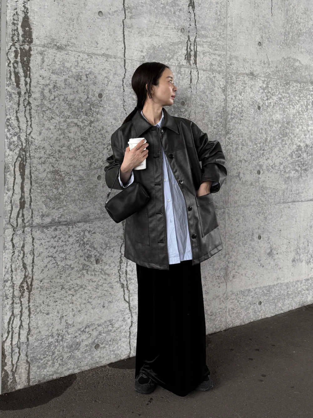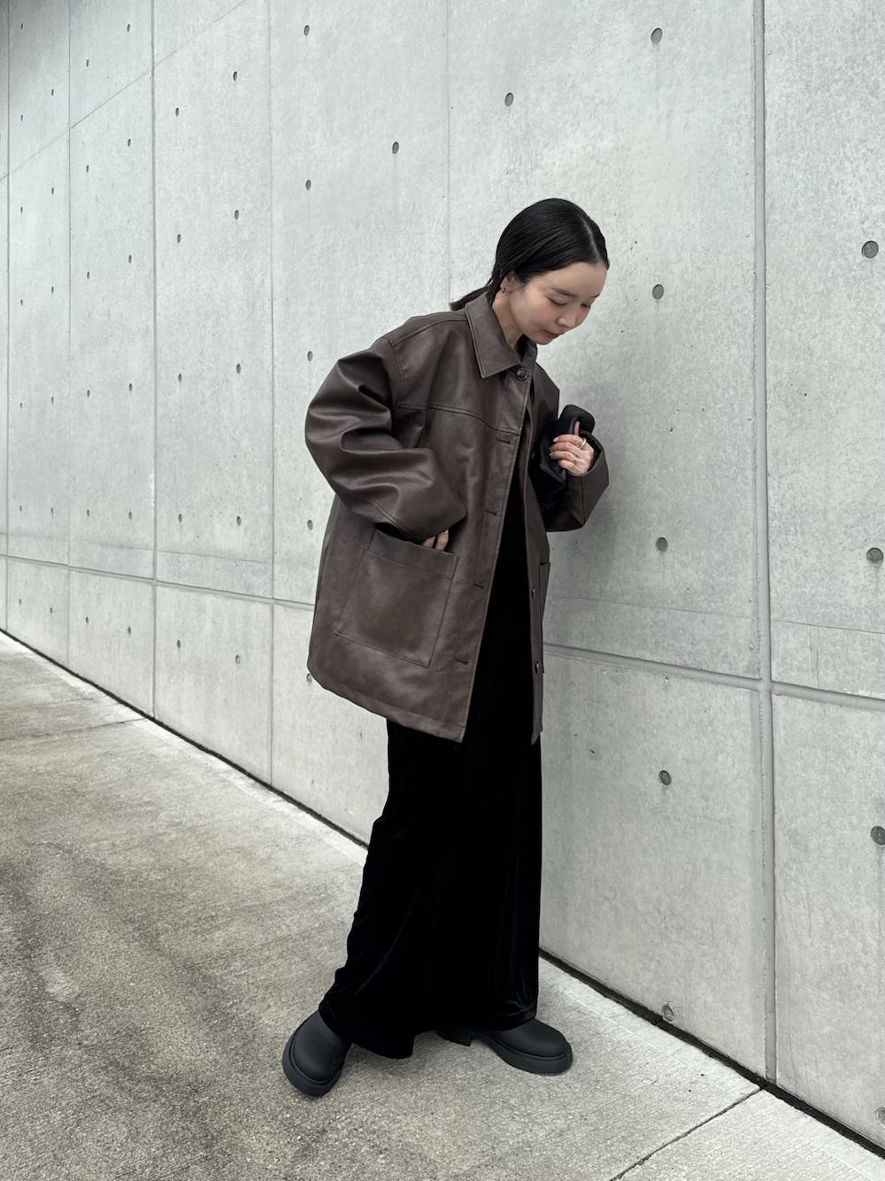 當想呈現知性成熟氣息的話,不妨選穿中長版皮衣外套,能遮屁屁的長度,在穿著時也能增加顯瘦修飾,融入本季超夯的絲絨長裙,落地長度是非常時髦的款式之外,利用深色系混搭技巧,立即提升日系優雅大人感。