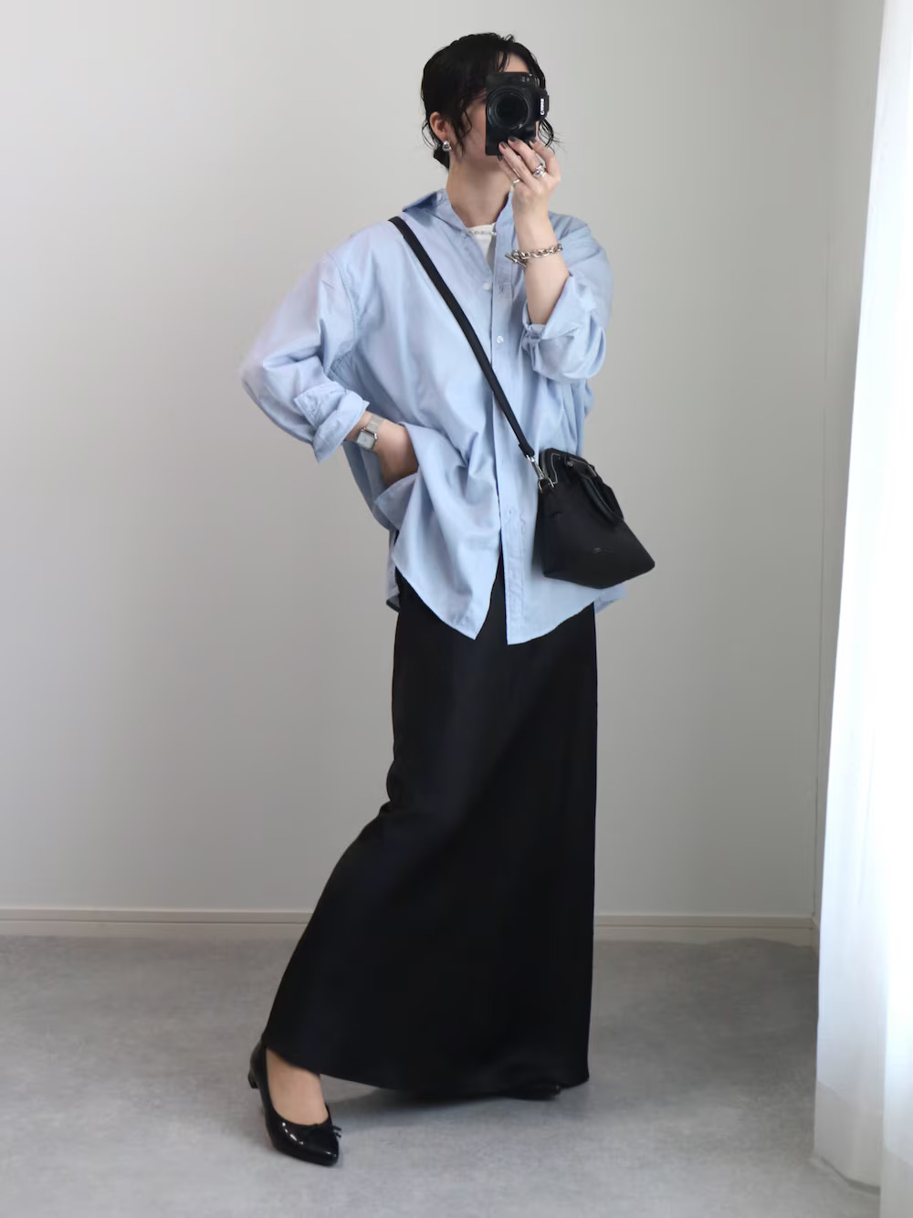 堪稱秒顯高級度配色的首選,絕對非「天空藍與黑」莫屬,以天空藍襯衫混搭黑色裙子,俐落的穿搭技巧打造專屬時髦態度,當天氣轉涼的時候,不妨加入西裝外套、風衣混合,便能快速點亮注目的層次魅力。