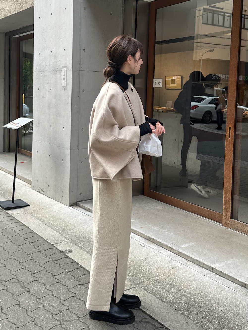 東北地方穿搭範例02:高領上衣 + 無領外套 + 毛呢裙