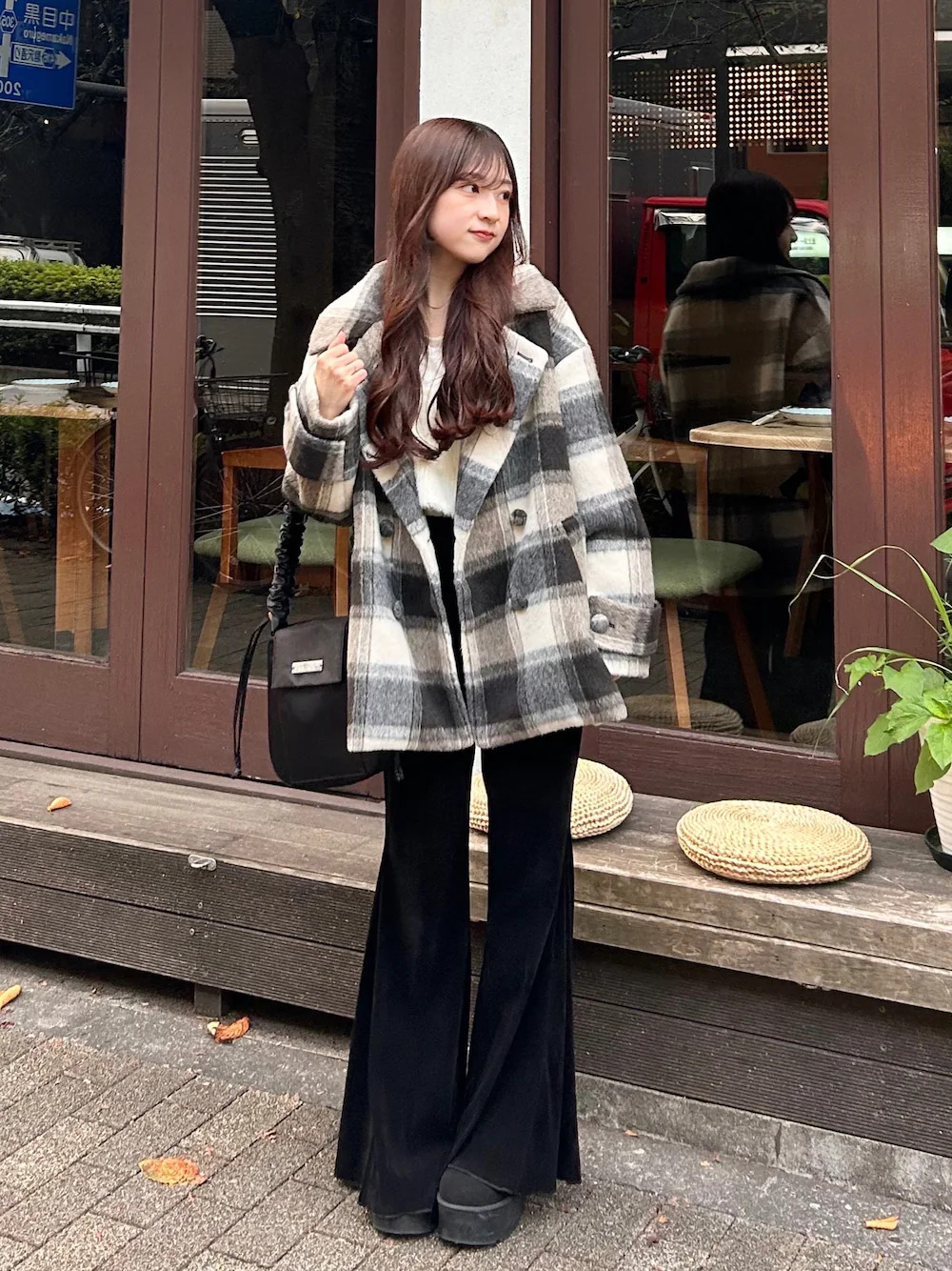 東北地方穿搭範例03:中長版大衣 + 絲絨喇叭褲