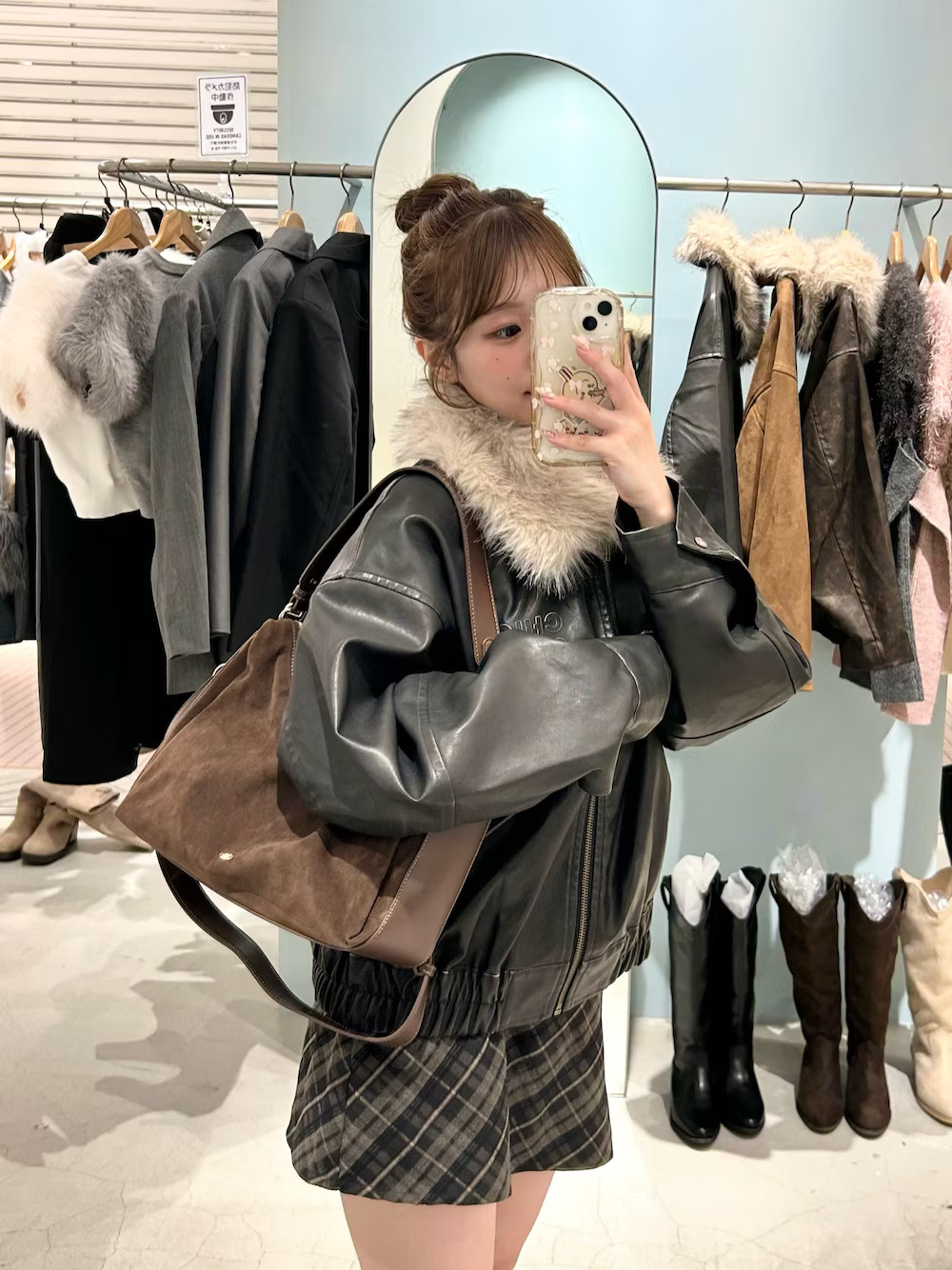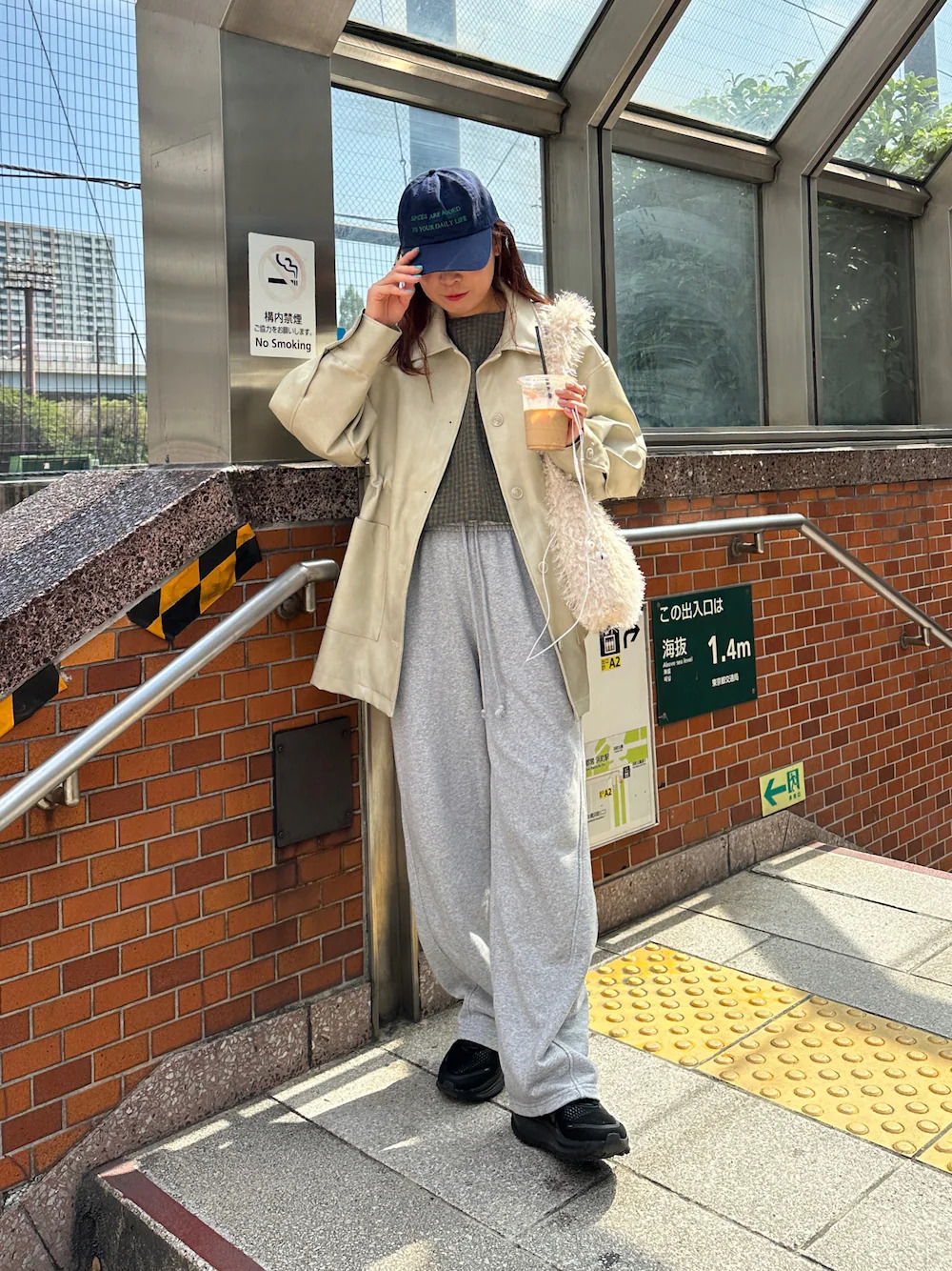皮衣外套、棉質長褲、棒球帽的混搭技巧,使造型凸顯一股中性男孩的率性氛圍,呈現兼具鬆弛感的簡約搭配,尤其在懶得整理頭髮時,棒球帽絕對是不可或缺的百搭小幫手,堪稱是 2025 秋季日本女生最愛的出遊穿搭組合。