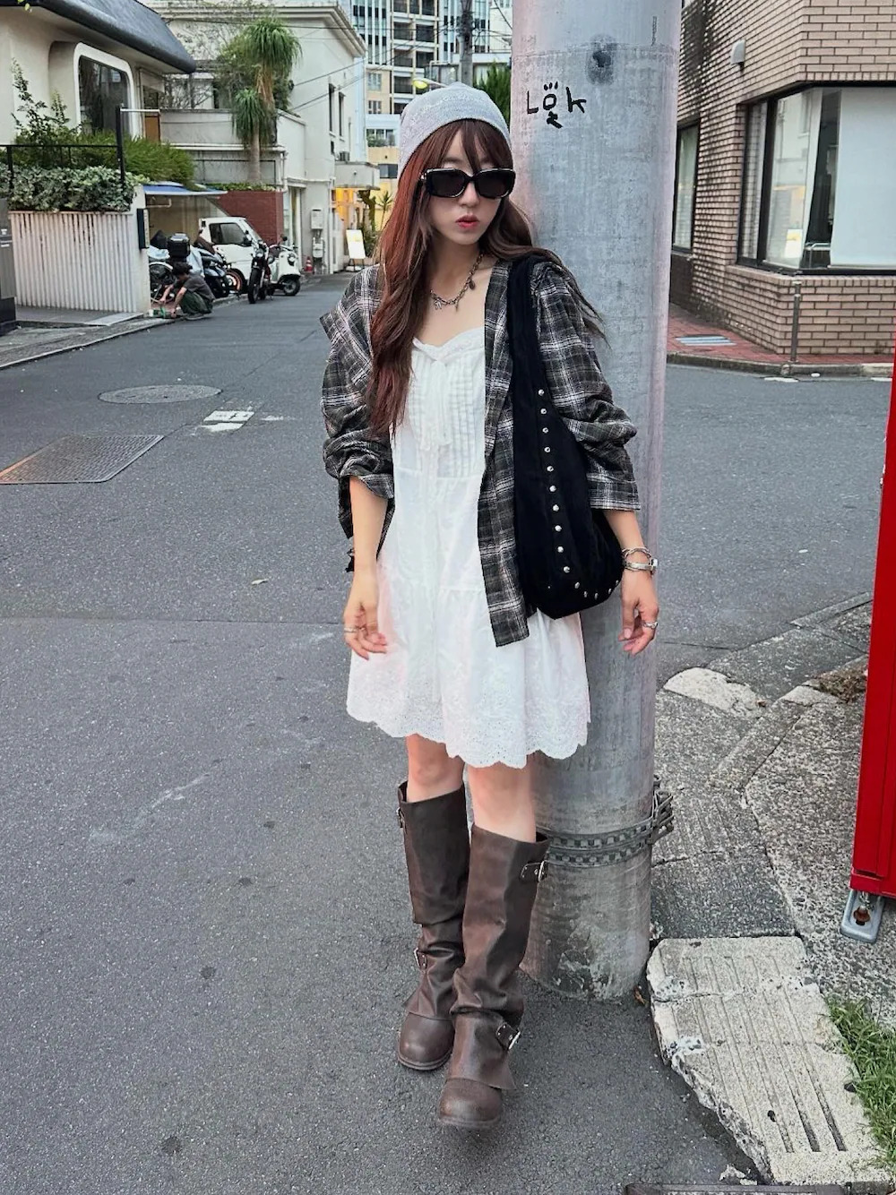 關東地方穿搭範例01:毛料襯衫 + 洋裝 + 針織帽