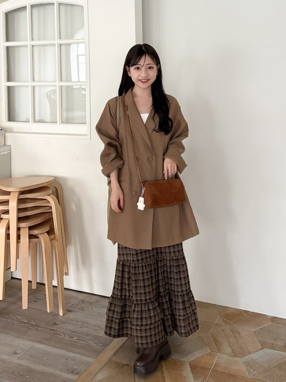 關東地方穿搭範例02:西裝外套 + A字長裙