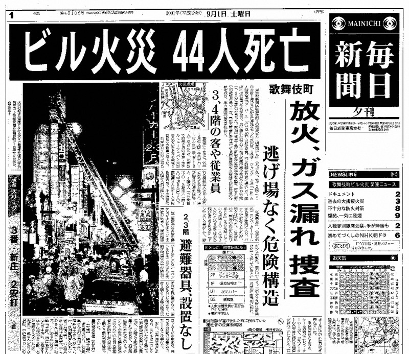 2001年9月1日,此時的歌舞伎町雖然仍燈火通明,在這裡有一棟名為明星五十六大樓的住商混合大樓,內部包括色情按摩店、麻將館以及摸摸茶等,是一棟出入混雜的大樓。凌晨1點左右,從大樓的3樓傳來幾聲蹦蹦的爆炸聲,隨後便是濃濃的黑煙從大樓竄出,一名麻將館的員工從緊急出口跳下,好不容易才躲過了死亡的命運,並趕緊撥打電話呼叫了消防隊。