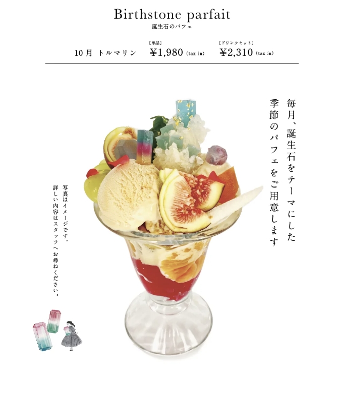 以每個月的誕生石/生日石為主題,會放上符合當月誕生石造型的寶石琥珀糖,並結合當季食材製作而成的「誕生石聖代」(誕生石のパフェ),每個月能品嘗到的口味都不同,既然都來了,一定要點一客來好好品嘗一番。