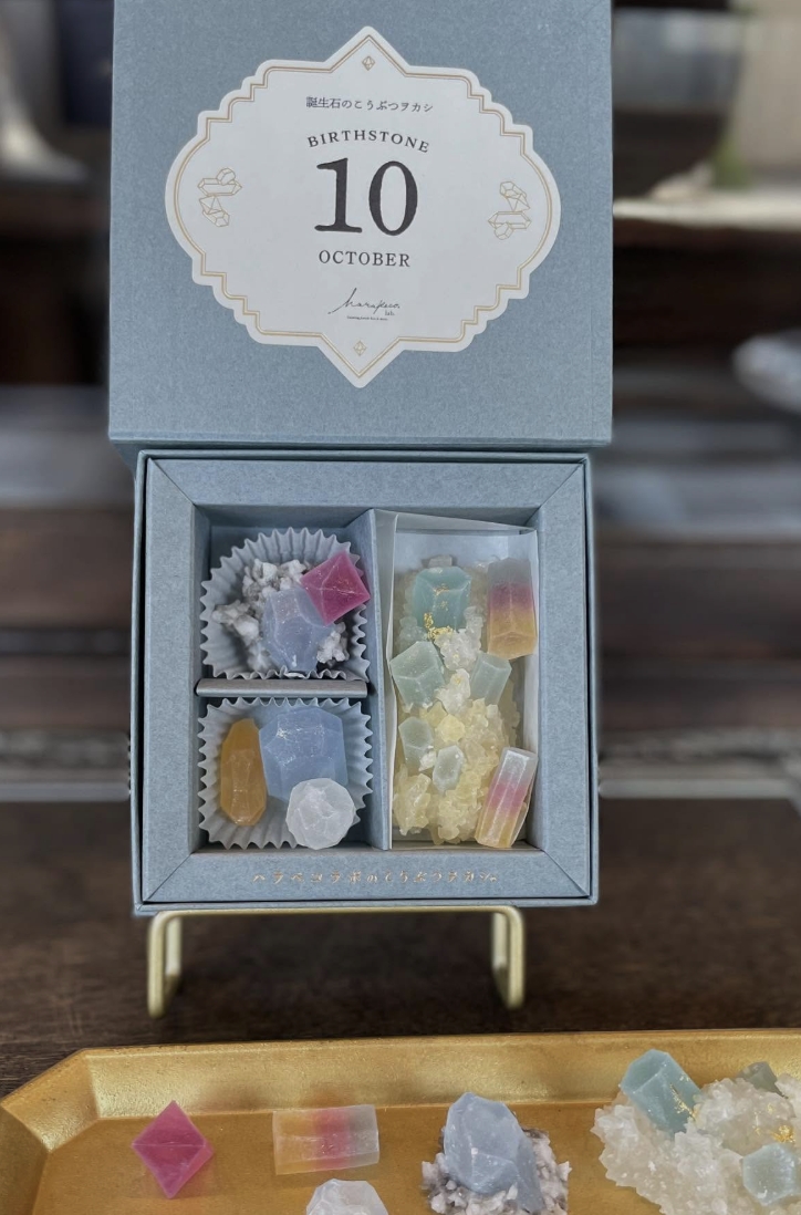 而這邊所販售的琥珀糖伴手禮,也有特別推出月份限定的誕生石款式,譬如10月份所販售的誕生石琥珀糖組合名為「Tourmaline」,裡面能見到代表10月份的誕生石:電氣石、蛋白石等礦物造型的琥珀糖,每一顆都美得讓人捨不得吃下肚呢~作為贈禮來說可是心意滿滿。