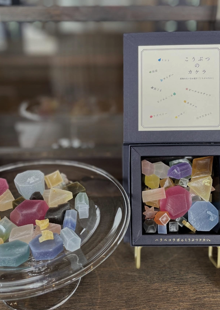 將藝術與食物融合,專門製作出各式各樣媲美閃亮寶石一般的琥珀糖商品與餐點的「harapecolab」(ハラペコラボ),旗下有著琥珀糖品牌「Koubutsuwokashi」(こうぶつヲカシ),以及位於福岡的店舖兼咖啡廳「harapecolab museum shop & cafe」(ハラペコラボ ミュージアムショップ&カフェ)。
