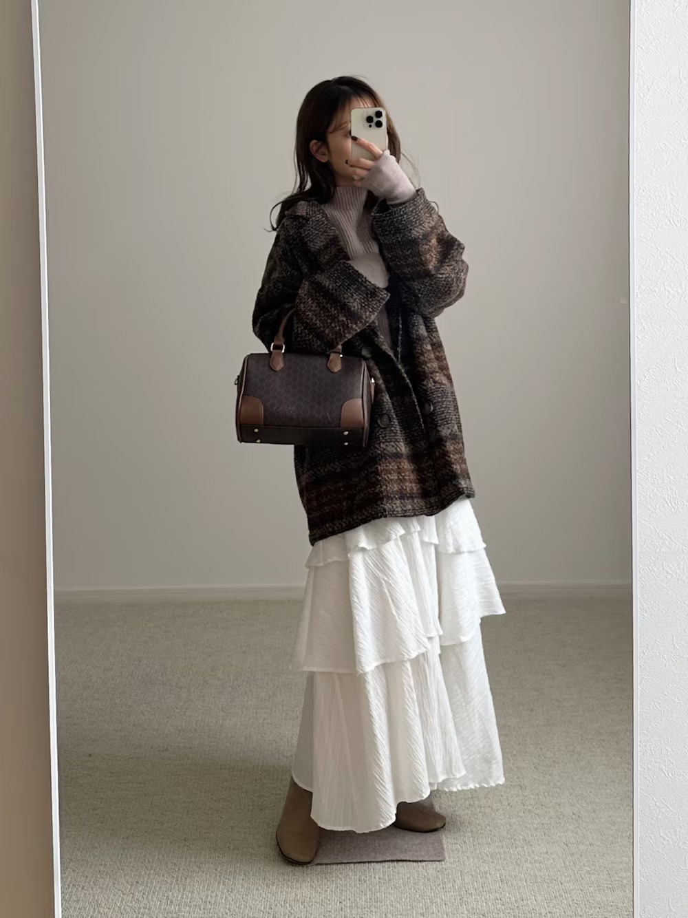 每到冬季便會回歸的西裝外套,向來是日本女生日常的最愛,以厚料材質為主的西裝外套,像是針織、毛絨都是很不錯的選擇,下半身選搭蛋糕裙,使知性與甜美風格,混搭出嶄新視覺火花,鞋履搭短靴、球鞋就很好看加分。