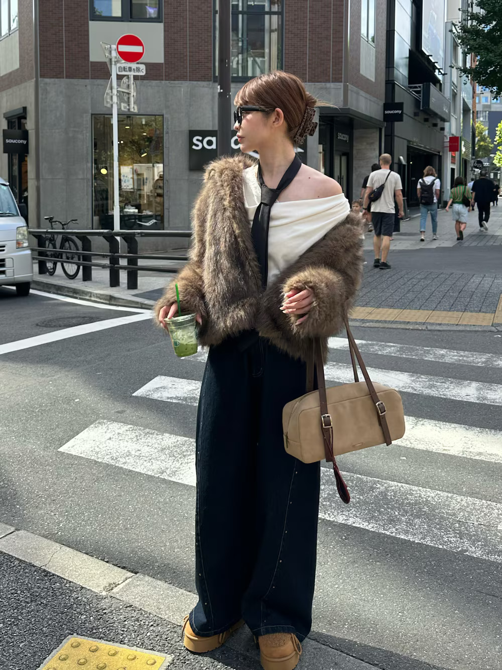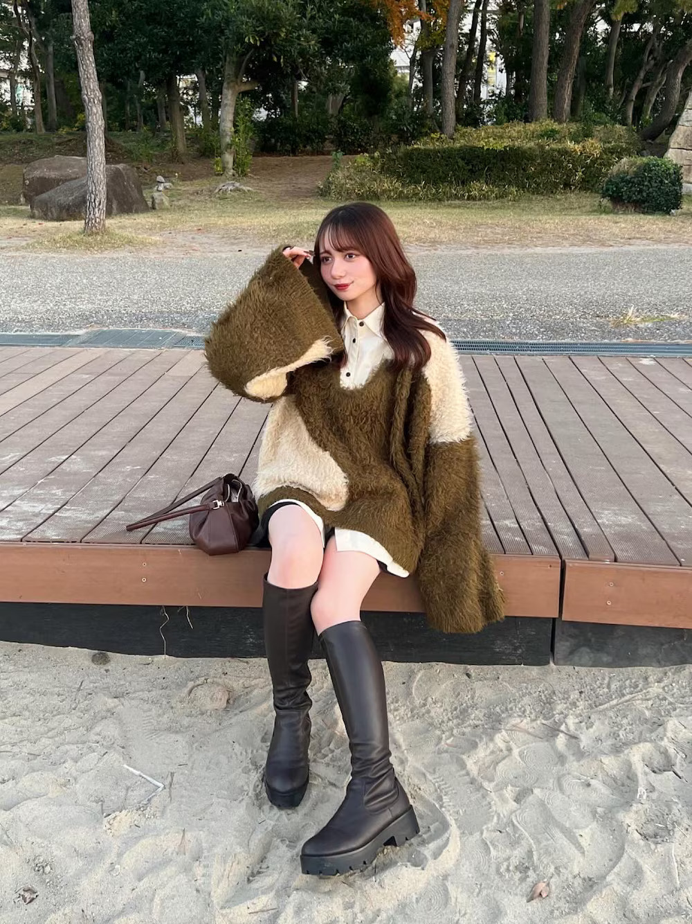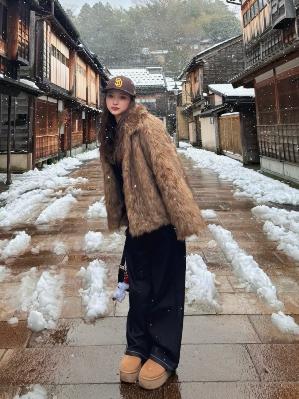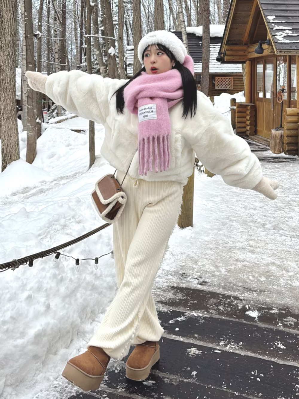 東北地方穿搭範例03:毛絨外套 + 針織褲