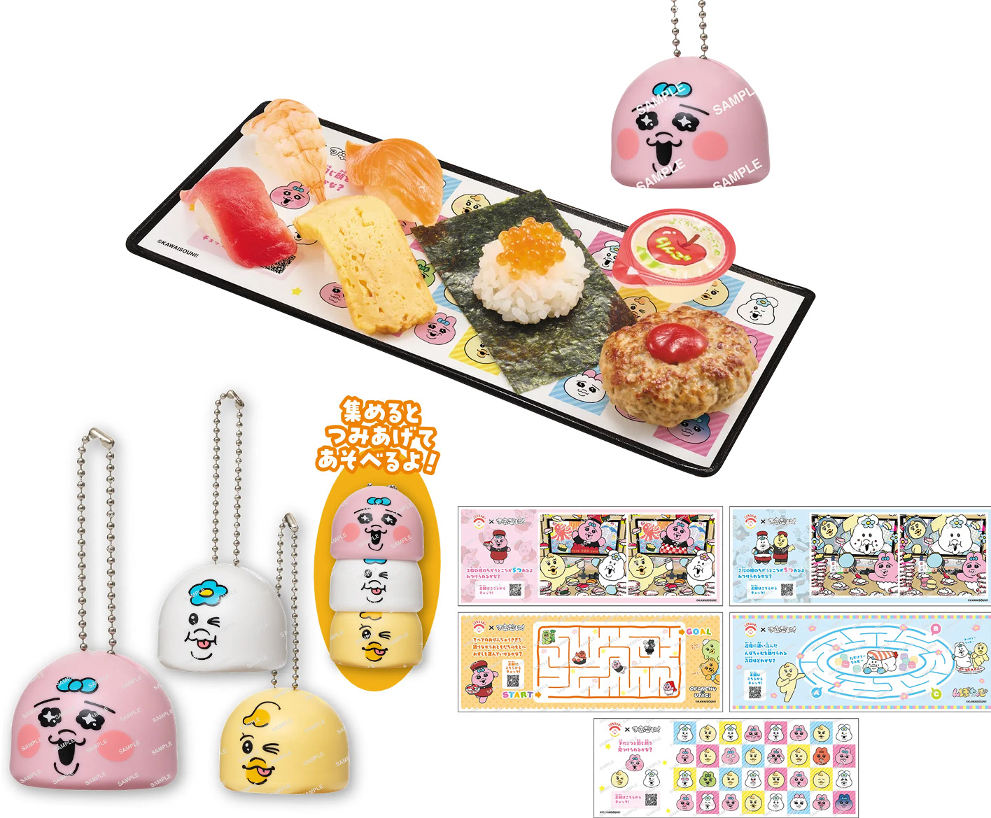 除了單點的壽司之外,還有這個套餐組合也是本次聯名指定餐點,有蝦子握壽司、鮭魚握壽司、鮪魚握壽司、玉子燒握壽司、鮭魚卵壽司、漢堡排壽司以及點心果凍一個,隨餐還會附上一款褲褲兔或是優格精靈、優格精靈的好朋友Kimimaro(きみまろ)的造型吊飾,三款隨機附贈,若有機會集滿三款,還能把他們疊起來,像是疊疊樂一樣。