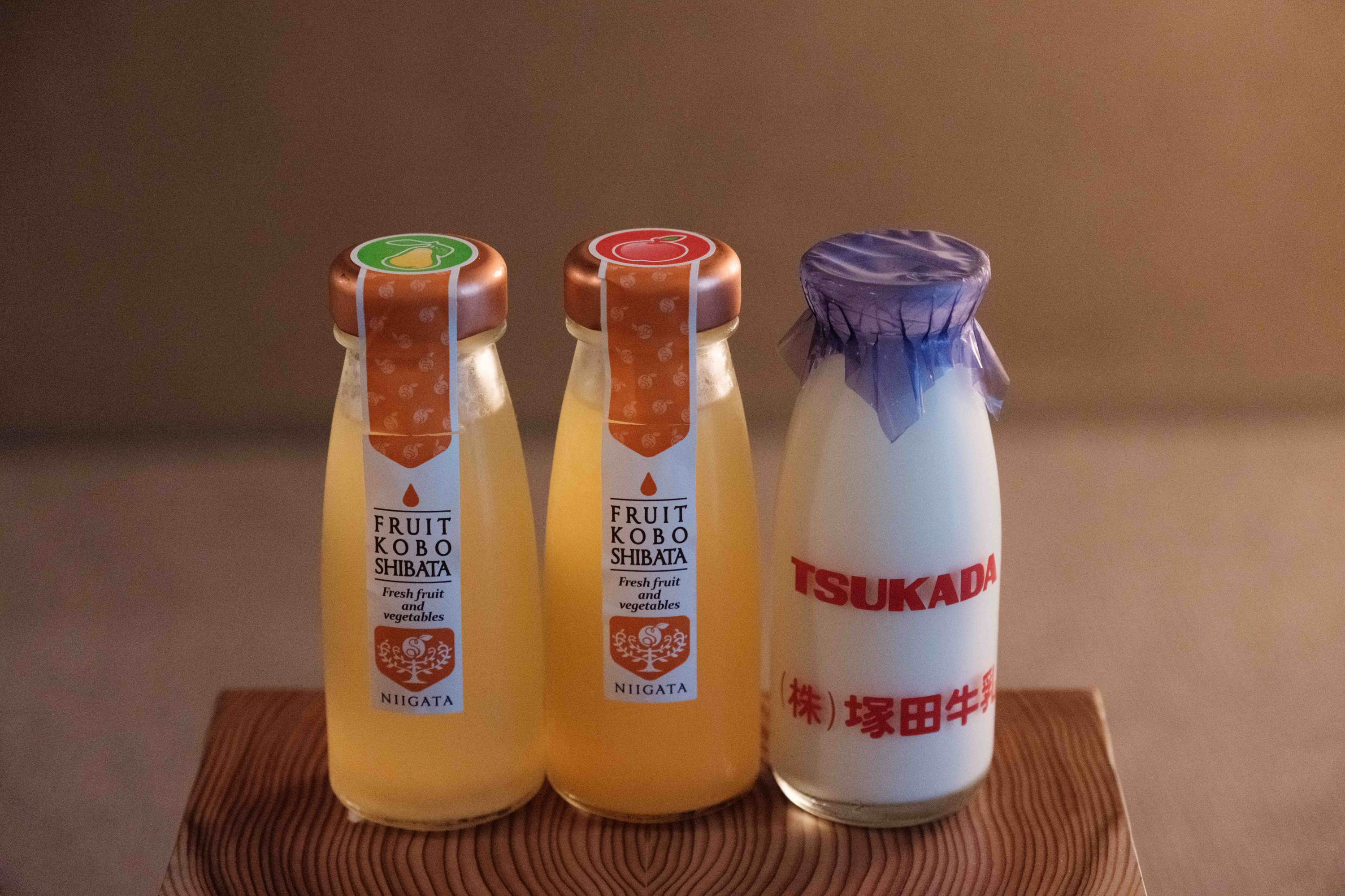 客房內也貼心準備了免費的小點與飲品,適合夜間享用。包含新潟在地的仙貝、果汁、牛奶與日本酒等,展現濃厚的地域風情。館內備品以木質為主,從牙刷到刮鬍刀手柄皆盡量減少塑膠使用。
