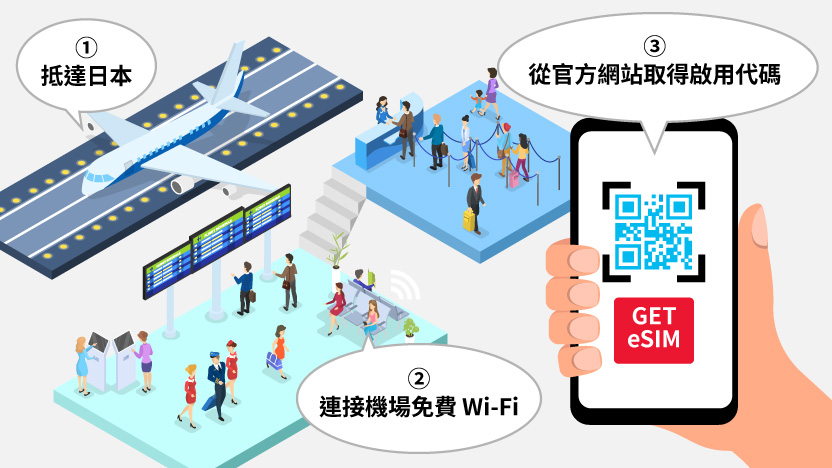 使用方式非常簡單:抵達日本後,只要利用機場等場所的 Wi-Fi 進入官方網站取得啟用代碼,再用手機掃描畫面上顯示的 QR Code,設定就完成了。