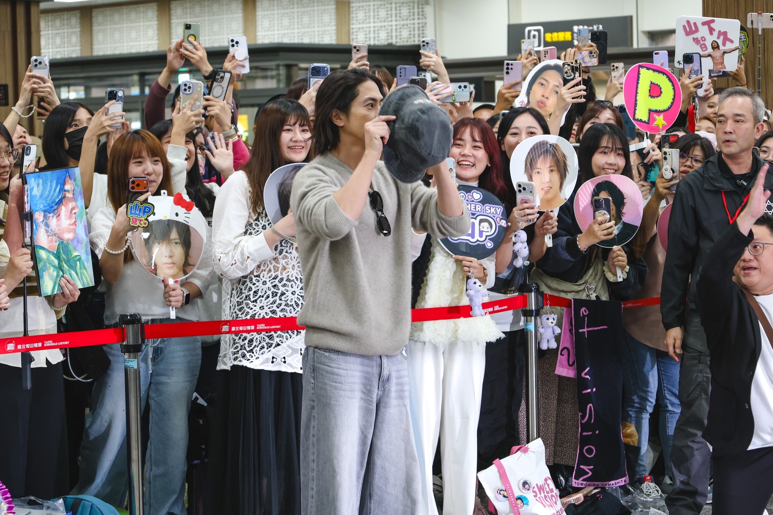 為感謝粉絲們久候迎接,山下智久現場也脫帽致意回應台灣粉絲們的溫暖。