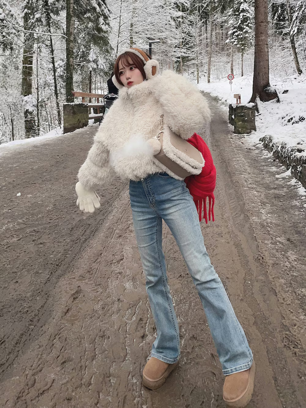 關東地方穿搭範例02:毛絨外套 + 牛仔褲
