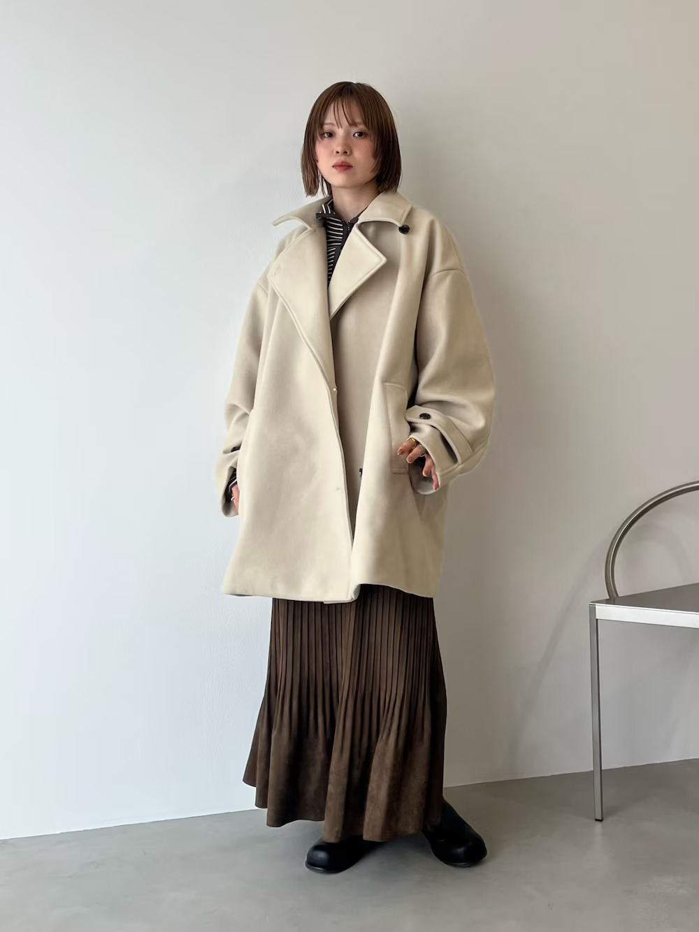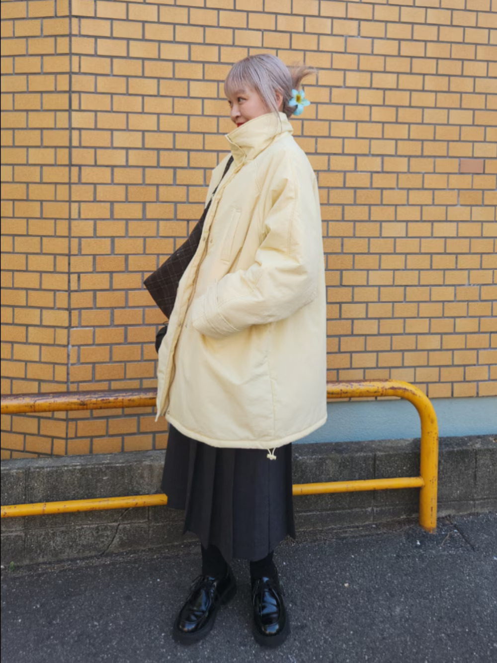 關東地方穿搭範例03:鋪棉外套 + 百褶中長裙