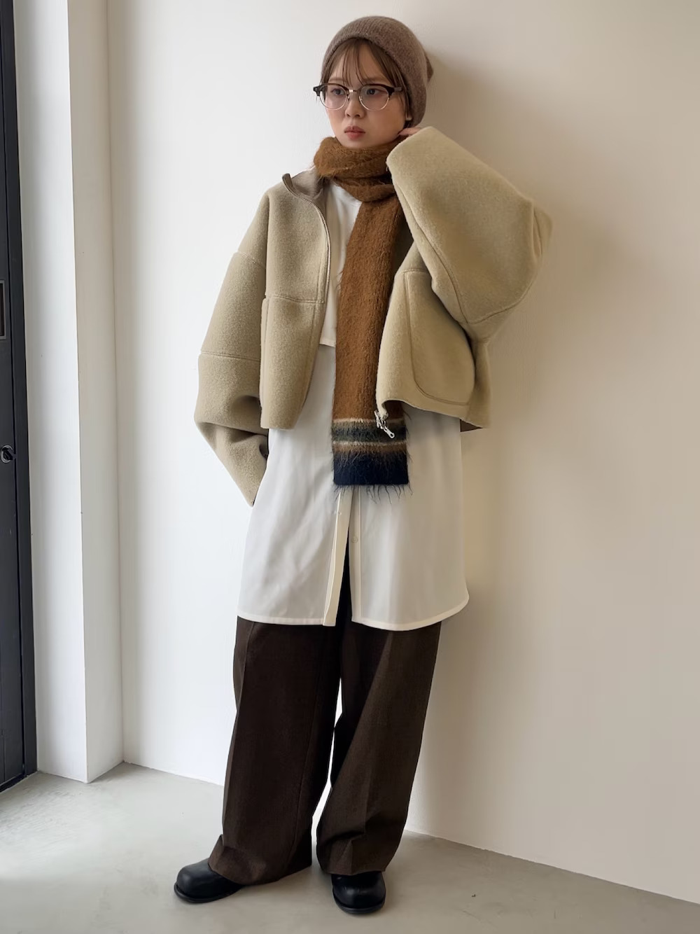 東北地方穿搭範例01:絨毛外套 + 長襯衫