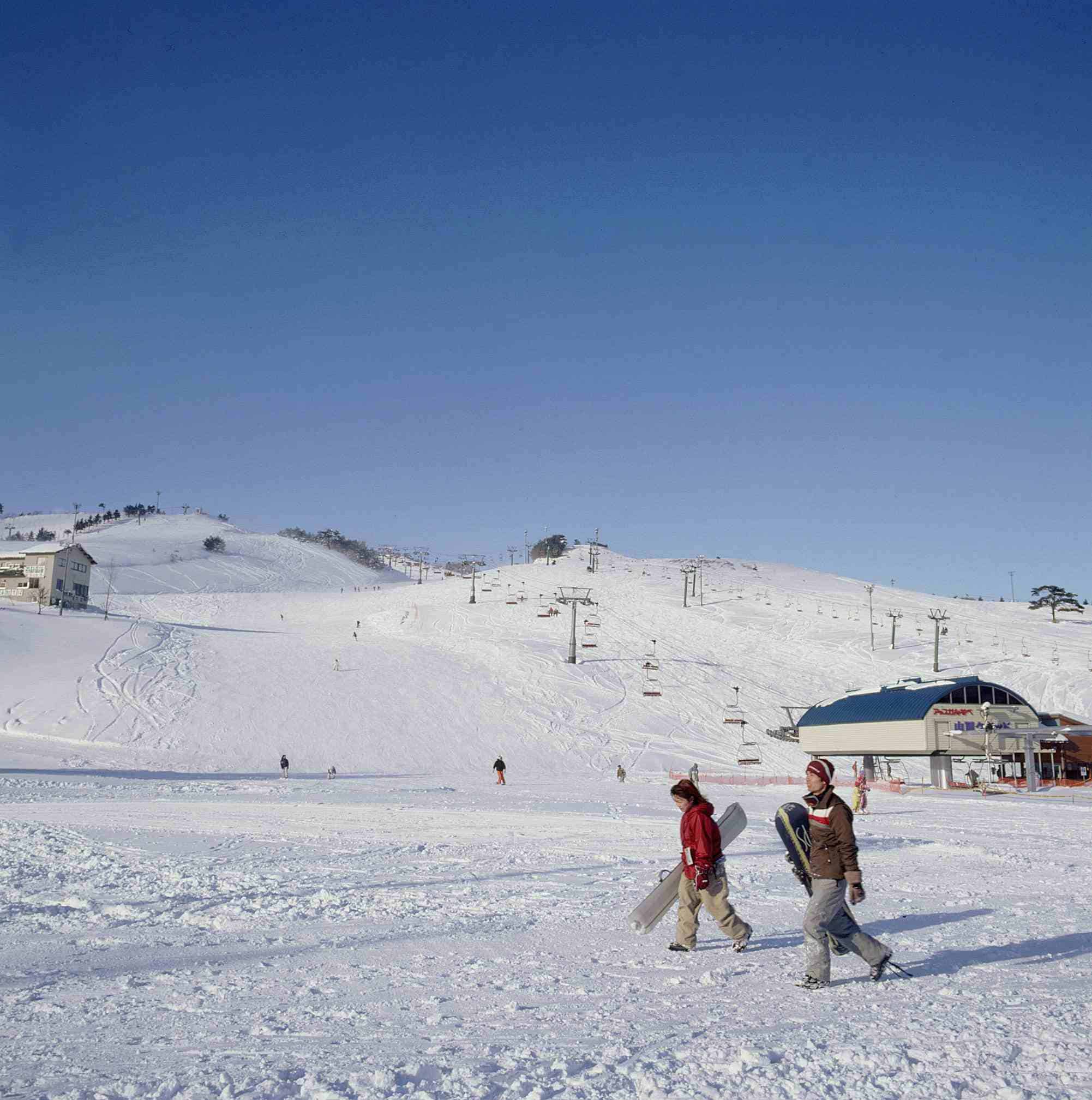 位於神鍋高原南側入口的「萬場滑雪場」,以高技術性聞名。共有 7 條雪道,其中三角A、B、C 雪道平均坡度達 30 度,三角 A 更曾是「國民體育大會」指定比賽路線。這裡是中高級滑雪者挑戰極限、磨練技術的理想場地。緊鄰雪場的「藍嶺飯店」,以結合滑雪、溫泉與度假的完善設施而廣受好評。