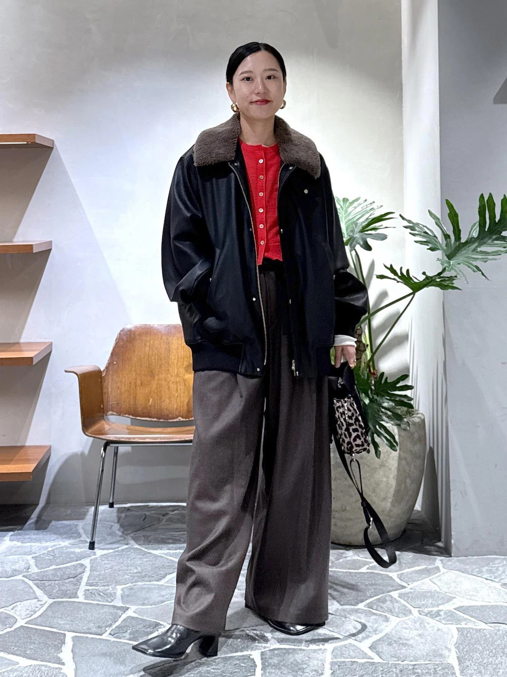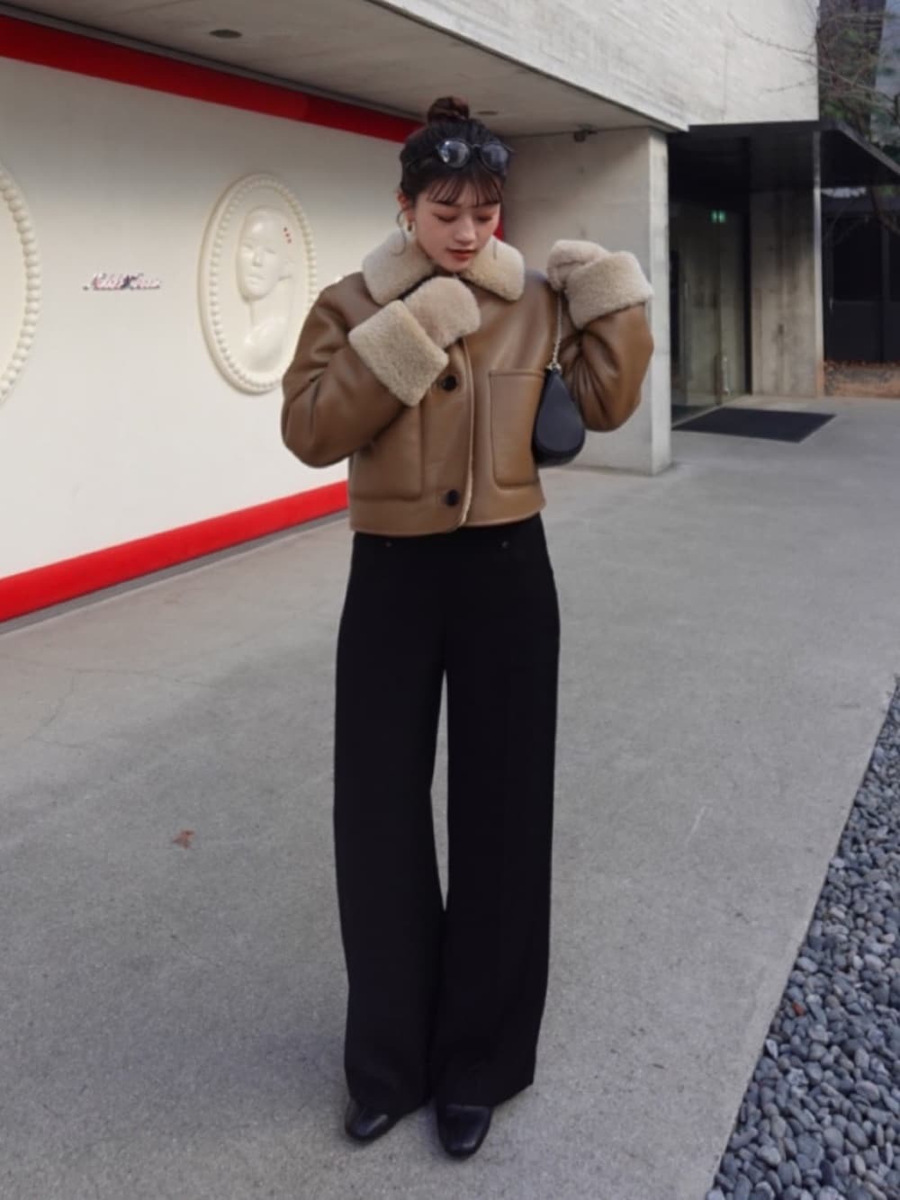 當想營造優雅兼具的女子氣息的話,不妨嘗試以毛領拼接外套搭黑色長褲,利用異材質拼接的細節設計,不用想過多層次疊搭,便能讓衣著營造搶眼聚焦度,而褲子可以選擇寬直筒、喇叭褲,同時使腿部線條看起來修長又筆直。