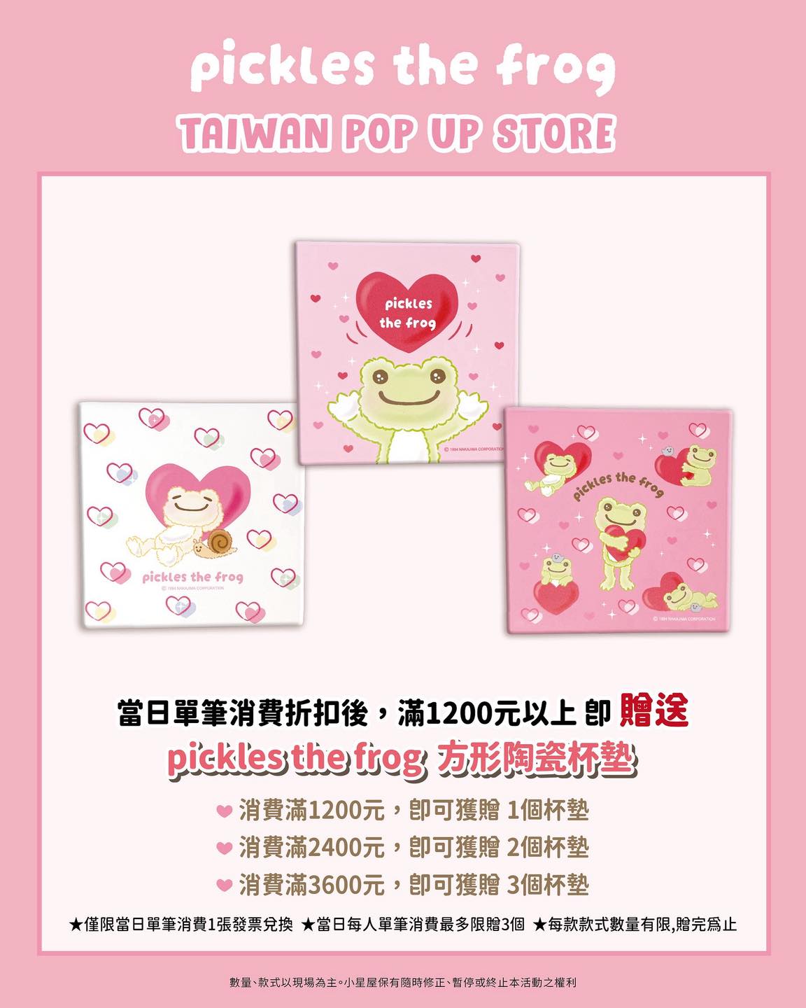新一季萌蛙匹克周邊,現正於台隆手創館京站門市獨家快閃中,萌蛙匹克「SMILE Heart」快閃專區限定,單筆購物滿1,200元即贈獨家款-萌蛙匹克「SMILE Heart」陶瓷杯墊一個,滿2,400元贈送2個、滿3,600元送3個(活動贈品共有三款,每人每日最多限贈3個贈品,恕不挑款,贈完即止)。