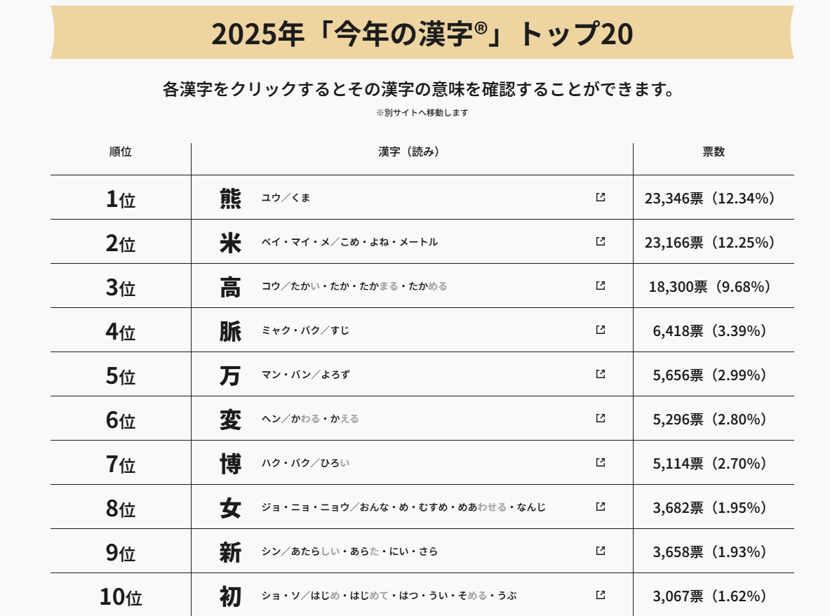 每年12月12日,日本都會迎來一個極具象徵意義的時刻——「今年的漢字」正式發表。由公益財團法人日本漢字能力檢定協會主辦,透過全國民眾投票選出一個最能代表當年世相的漢字,並於京都清水寺舉行書寫揭曉儀式。2025年度「今年的漢字」投票總數約 189,122 票,其中「熊」以 23,346 票 位居第一。第二名為「米」的 23,166 票,兩者之間差距極其接近,顯示民眾對多項社會議題的關注度都很高。此次「熊」是首次在年度漢字中獲選為第一名。