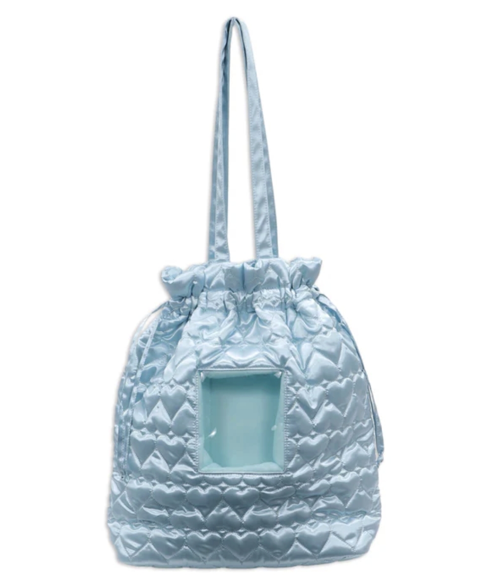 托特包做成束口袋抽繩的設計,正面還有設置透明開窗設計,剛好可以放入娃娃,開窗的大小適合10公分左右的娃。