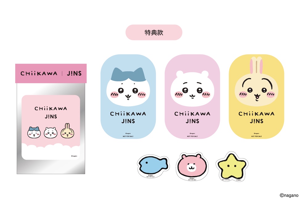 「JINS吉伊卡哇系列眼鏡」,將贈送「吉伊卡哇」盲抽貼紙一份 (特典款、吉伊卡哇、小八貓或兔兔共四款,數量有限,贈完為止)。