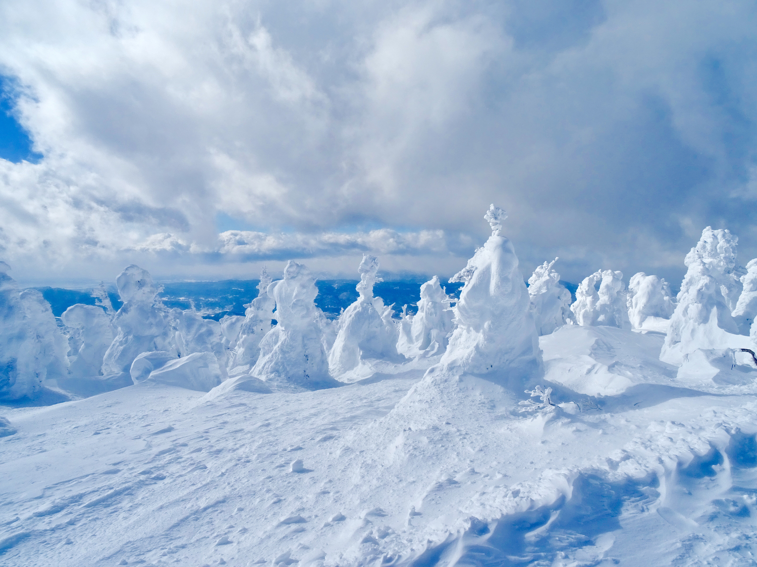 其中絕對不可錯過的,那就是在纜車上可以一覽全貌的「樹冰」了。樹冰是由西伯利亞帶來的寒冷季風,加上低溫讓日本海來的水氣在針葉樹上凝結並層層堆積所形成的自然美景,並列在山腰上的樣子彷彿是一頭頭怪物,而有著「冰雪怪物」的稱呼,是絕對不能錯過的壯觀景象。