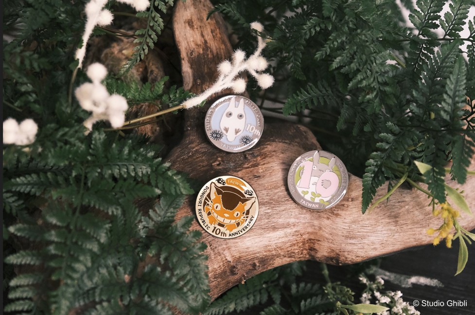 台灣限定滿額禮【10週年紀念金屬徽章】,左上為1月1日起開始贈送的小龍貓款、左下2月1日起贈送的貓巴士款,右下為3月1日起贈送的大龍貓款。© Studio Ghibli