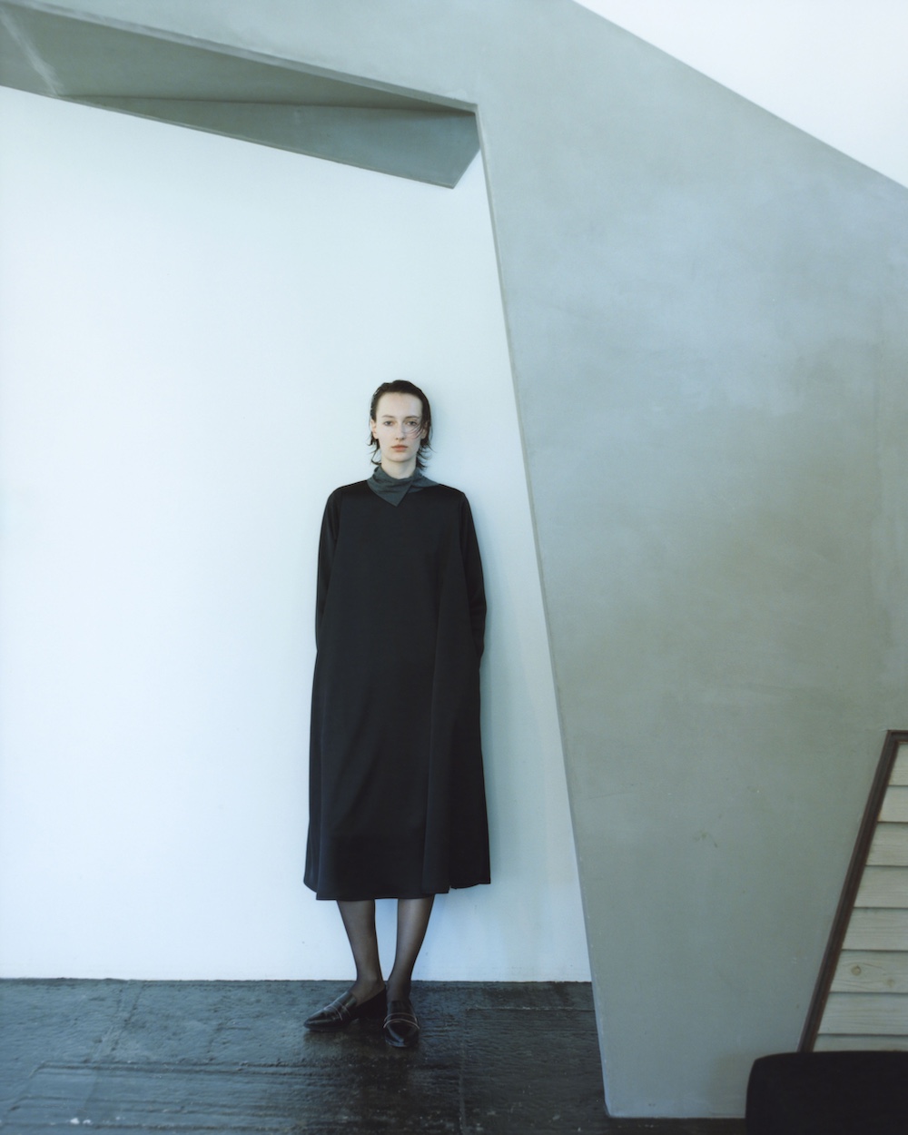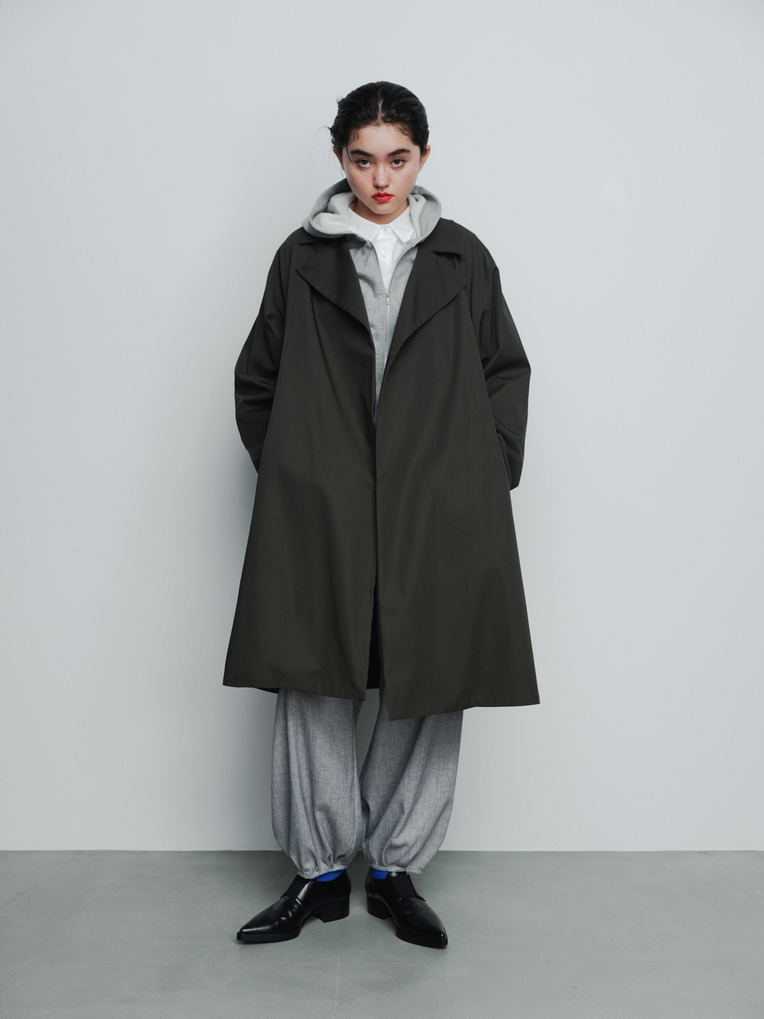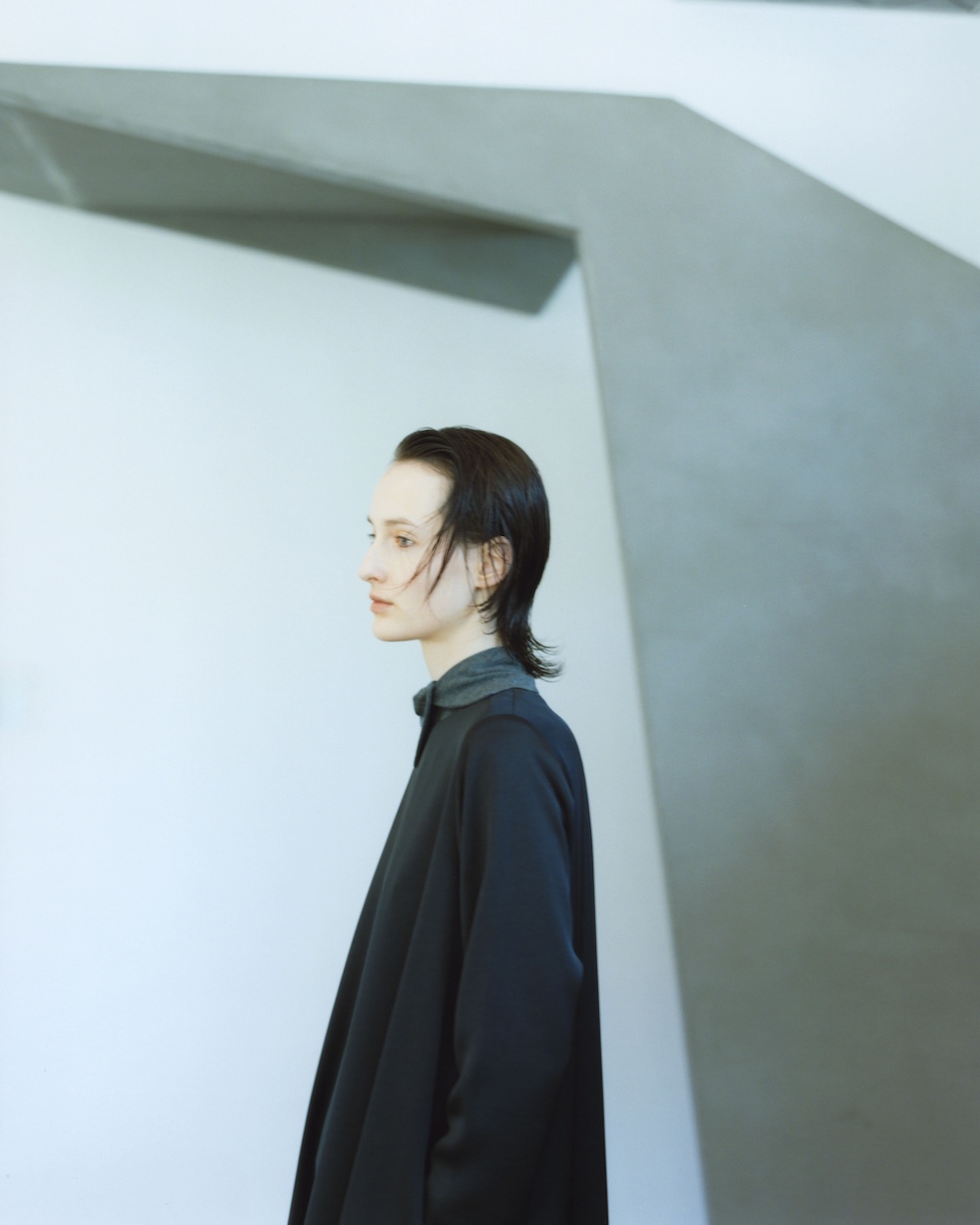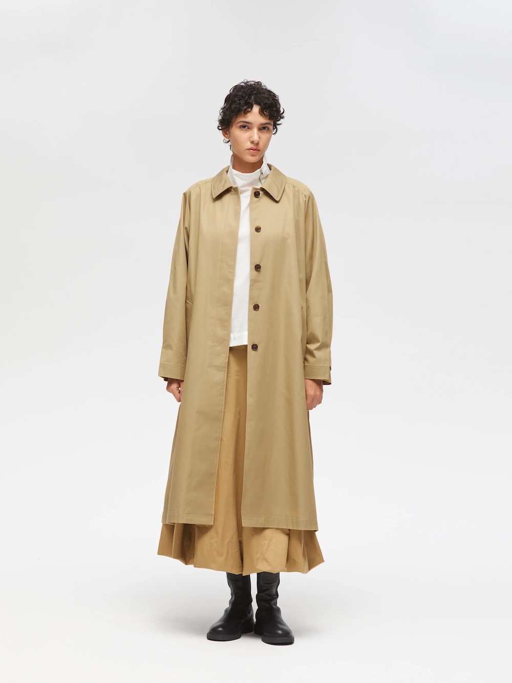 以經典風衣為基礎,極力簡化裝飾元素,適合日常多元搭配。材質選用挺度適中的棉質斜紋布。設計上,帶有工裝與軍裝感的設計語彙,運用圓弧造型的領片增添柔和的女性氣息,透過自然向外延展的傘狀剪裁,營造出俐落線條、帶有空氣感的穿搭風格。