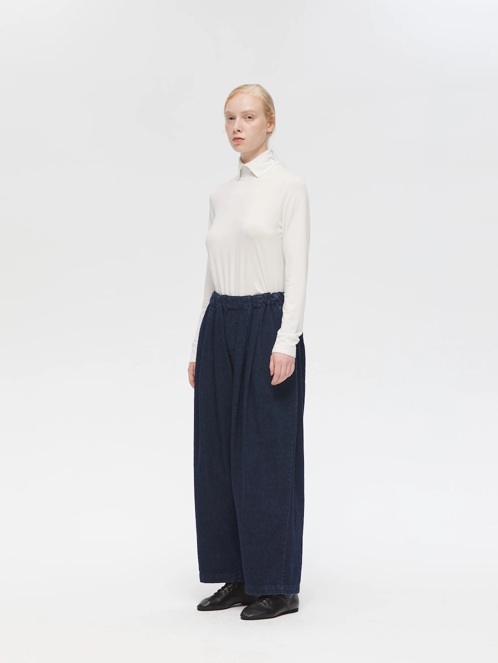 以寬版、繭型輪廓為設計重點的丹寧寬褲,選用來自日本岡山產的輕磅丹寧布料,質地柔軟、觸感親膚,可於多個季節靈活搭配。設計上,以黑色縫線作為細節點綴、褲身前側深打褶設計,勾勒出寬鬆而帶有圓弧感的立體輪廓。