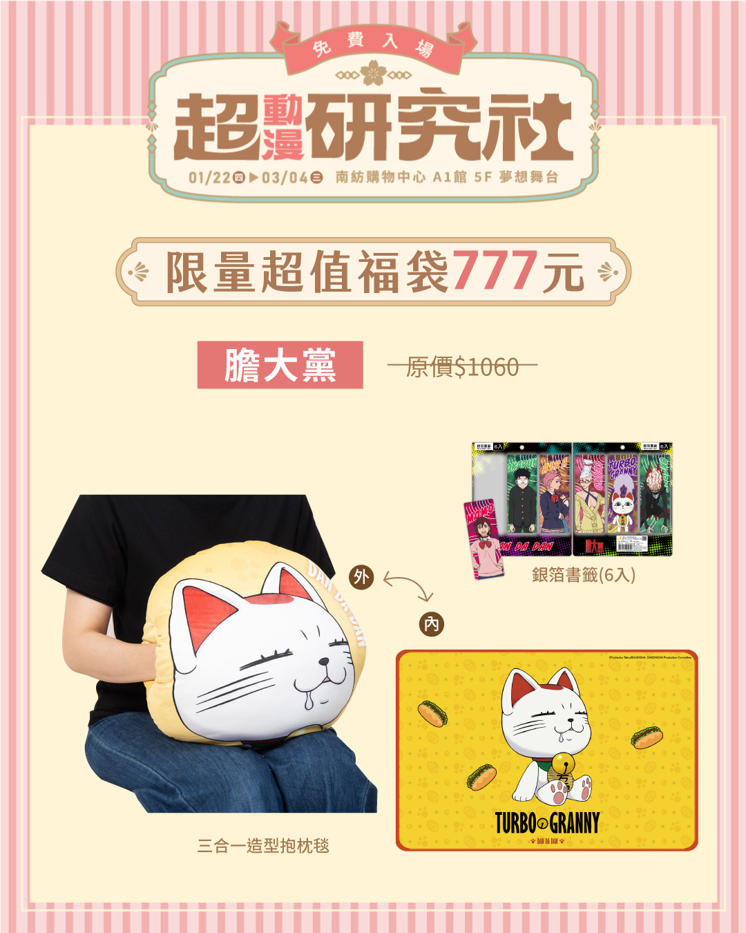 《膽大黨》福袋主打三合一造型抱枕毯,搭配銀箔書籤組,可愛與實用度一次到位。