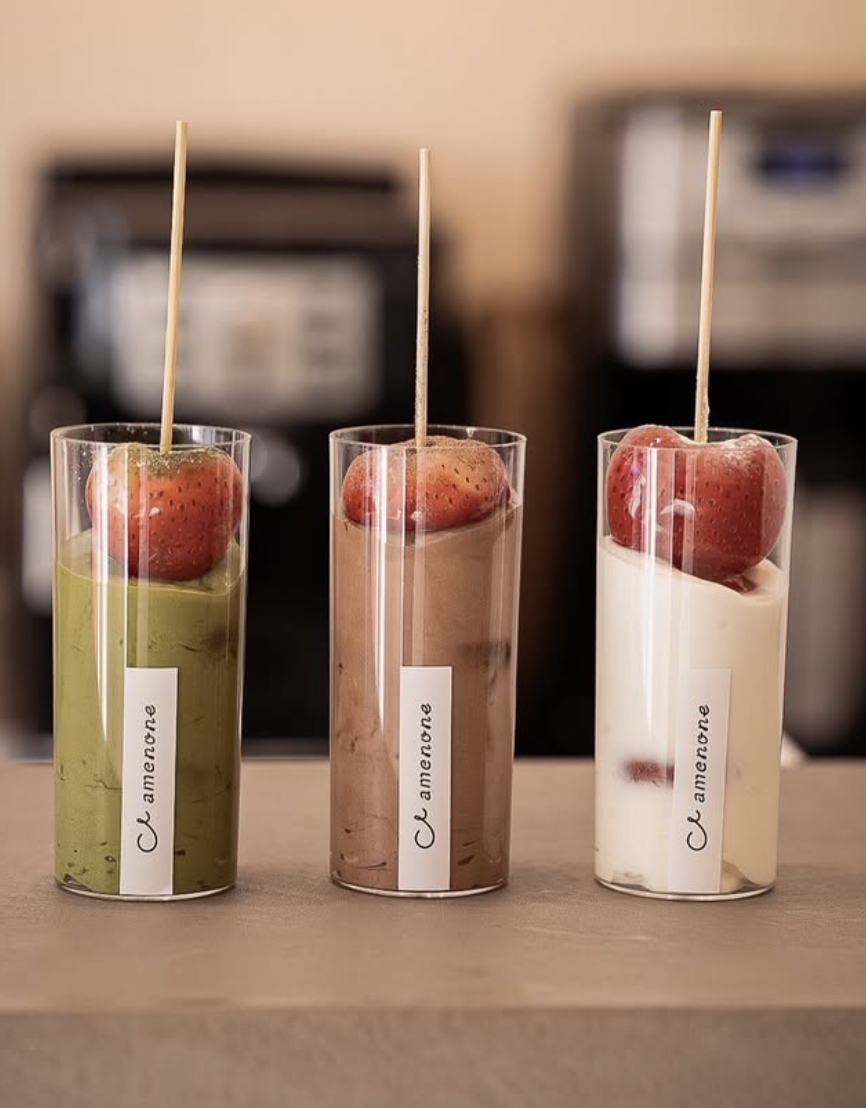 amenone自製了三種不同的沾醬:帶點苦味的抹茶醬、酸酸甜甜的優格醬,以及香醇濃厚的巧克力醬,和草莓糖葫蘆搭配在一起,意外地碰撞出齒頰留香的新滋味。