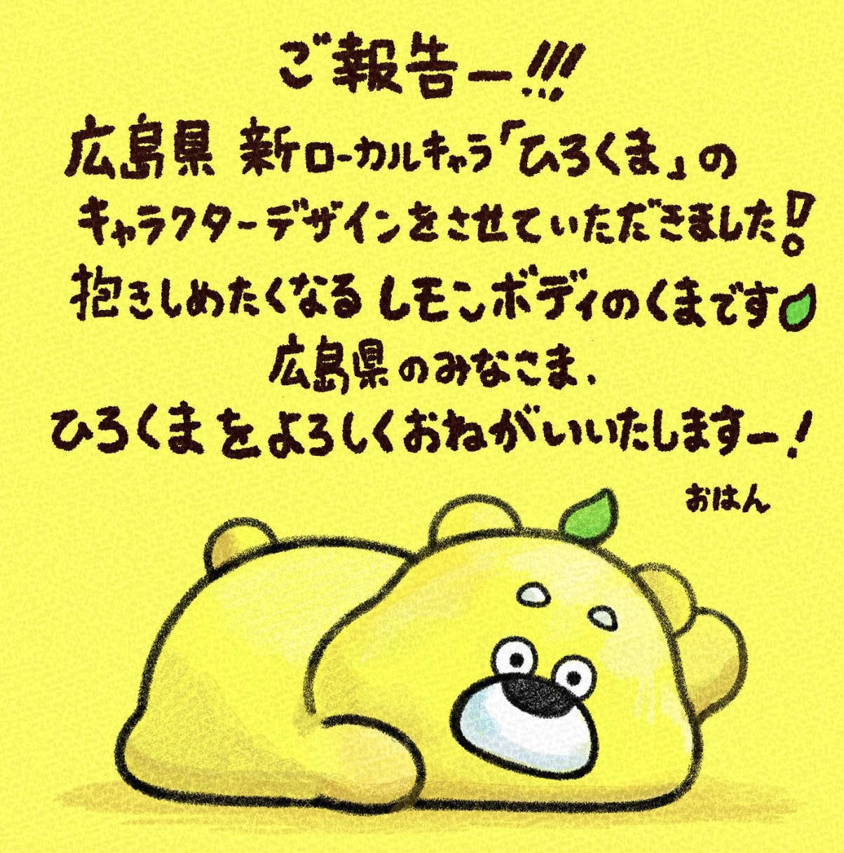 2023年自廣島縣誕生的「廣熊HIROKUMA(ひろくま)」(以下稱:廣熊),是一隻外型呈現黃色,長得圓滾滾的可愛小熊。身為一位道地的「廣島人」,廣熊非常喜愛自己家鄉的食物,還因為太喜歡廣島縣特產「檸檬」,吃檸檬吃到身體都變成黃色的,而且就連體香都充滿檸檬香氣呢!