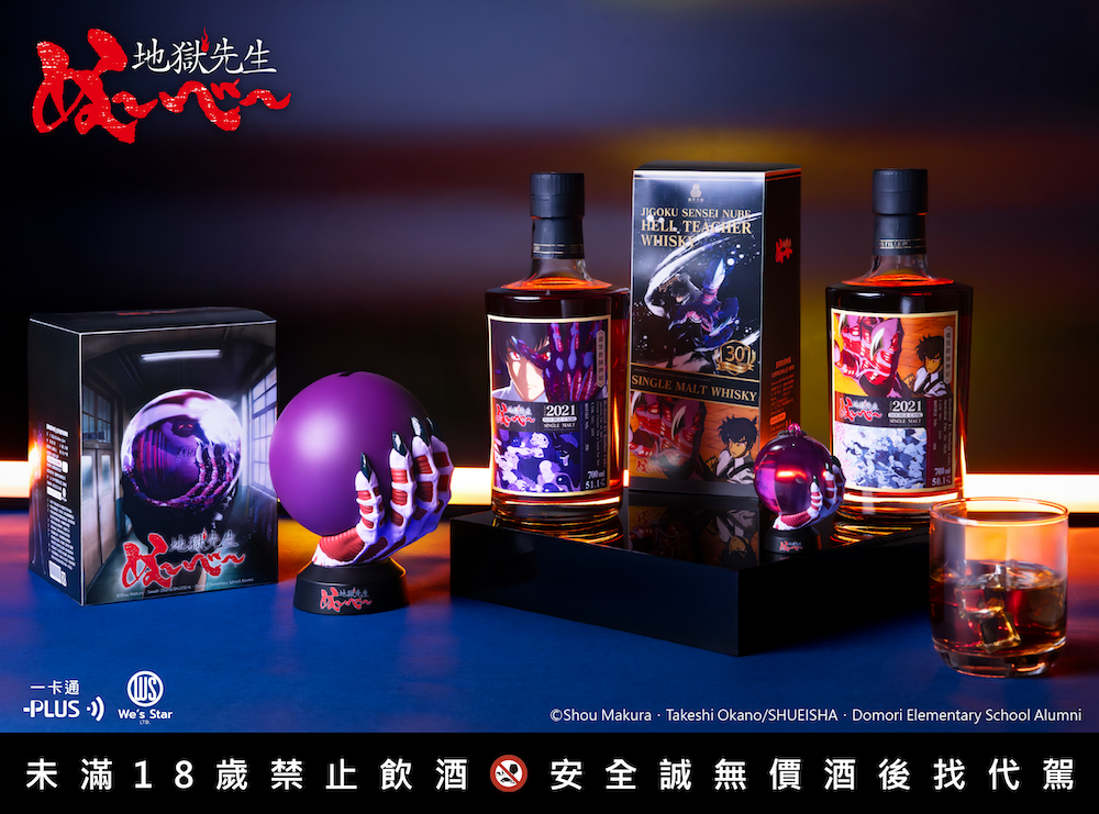 本次企劃重點分為兩大收藏亮點,重星戰略與鑫夢想共同企劃,取得日本官方授權,推出全球限量《靈異教師神眉30週年紀念威士忌》地獄款/鬼手款,更是粉絲圈討論度最高的商品之一。地獄款以深焙泥煤與深色系瓶身呈現異界陰鬱質感;鬼手款則結合封印之手手勢融入瓶身,象徵「守護之力」與主人翁鵺野鳴介的精神意象。兩款皆以限定量推出,瓶身兼具展示性與收藏性,今年粉絲必收的紀念酒款。