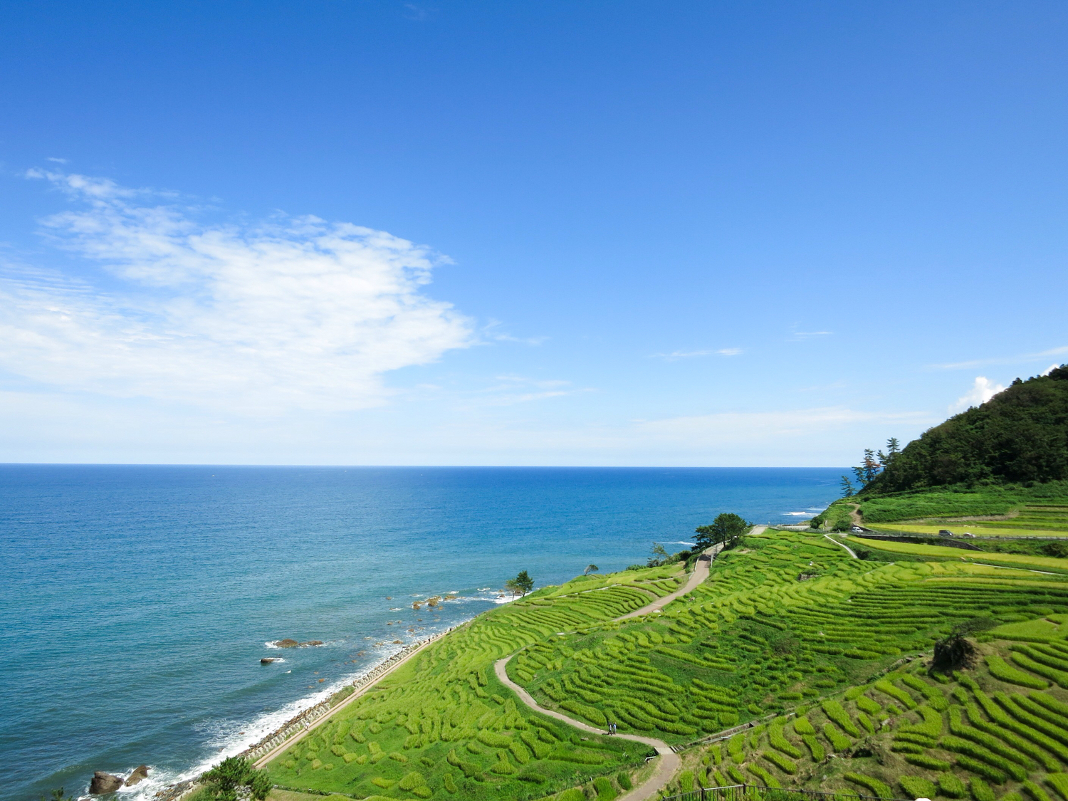 每年6月,白米千枚田伴隨著初夏的新綠景色,交織出壯觀的風景,深受觀光客的喜愛。到了傍晚,落日的橙色更增添了一絲迷人風采,染上橙紅的梯田與大海交織出的氛圍,讓人們彷彿踏入夢幻世界般駐足且流連忘返。